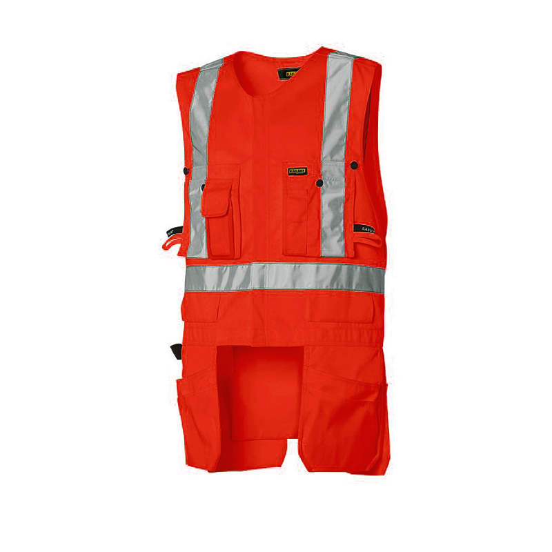 Skyddsväst med hög synbarhet som håller dina viktigaste verktyg inom räckhåll. Öppning i rygg för säkerhetssele. Reflexband runt om så att du syns från alla håll. Certifierad enligt EN471/EN ISO 20471, klass 2 skyddskläder med hög synbarhet.