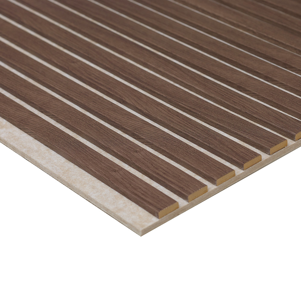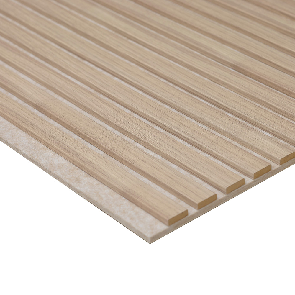 Varje panel består av 13 stycken ribbor med MDF-kärna som har en naturtrogen dekor. Dekoren är synlig på tre sidor med en mjuk kant. Dessutom är akustikpanelerna helt underhållsfria och enkla att montera. Bakom ribborna sitter en 9 mm svart polyesterfilt som är producerad av återvunna PET-flaskor och vi använder enbart trä som kommer från hållbart skogsbruk. Våra akustikpaneler är tillverkade i Småland. Panelen är dessutom brandklassad som D-s1,d2. En av fördelarna med akustikpanelerna är att de har ljudabsorptionsklass A, vilket reducerar efterklang och förbättrar ljudmiljön avsevärt. Panelerna är som mest effektiva på frekvenser mellan 300 Hz och 2000 Hz, vilket täcker ett stort spektrum. Det betyder att panelerna dämpar både höga toner och djupt ljud.