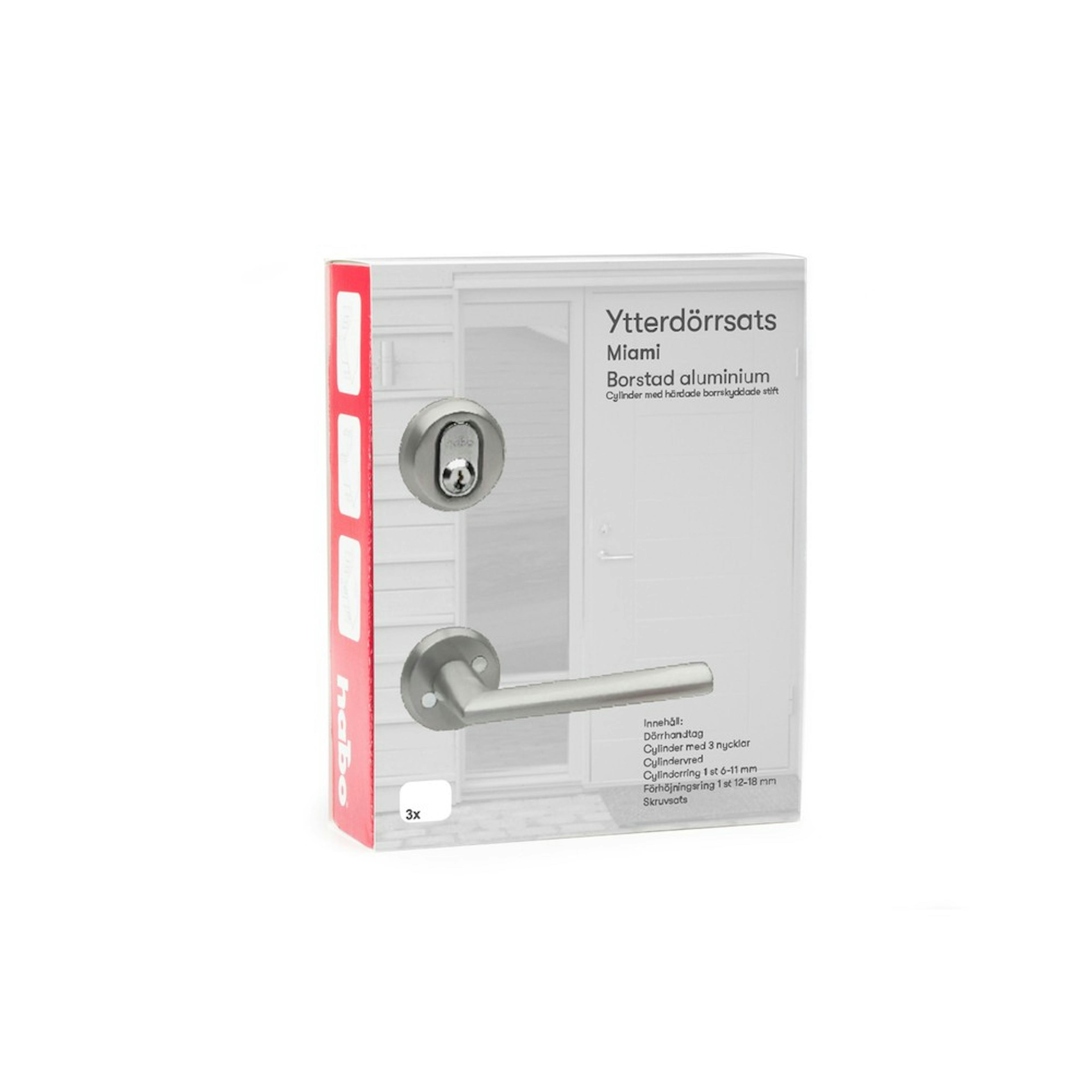 Beslagspaket Habo Miami är ett komplett ytterdörrsats av aluminium, med dörrhandtag Miami. Det har dubbelverkande returfjäder och är perfekt för bodar, fritidshus, garage etc. paketet levereras med cylinder inklusive 3 st nycklar, cylindervred, cylinderring Universal och skruvar. Passar dörrtjocklek 30-80 mm.