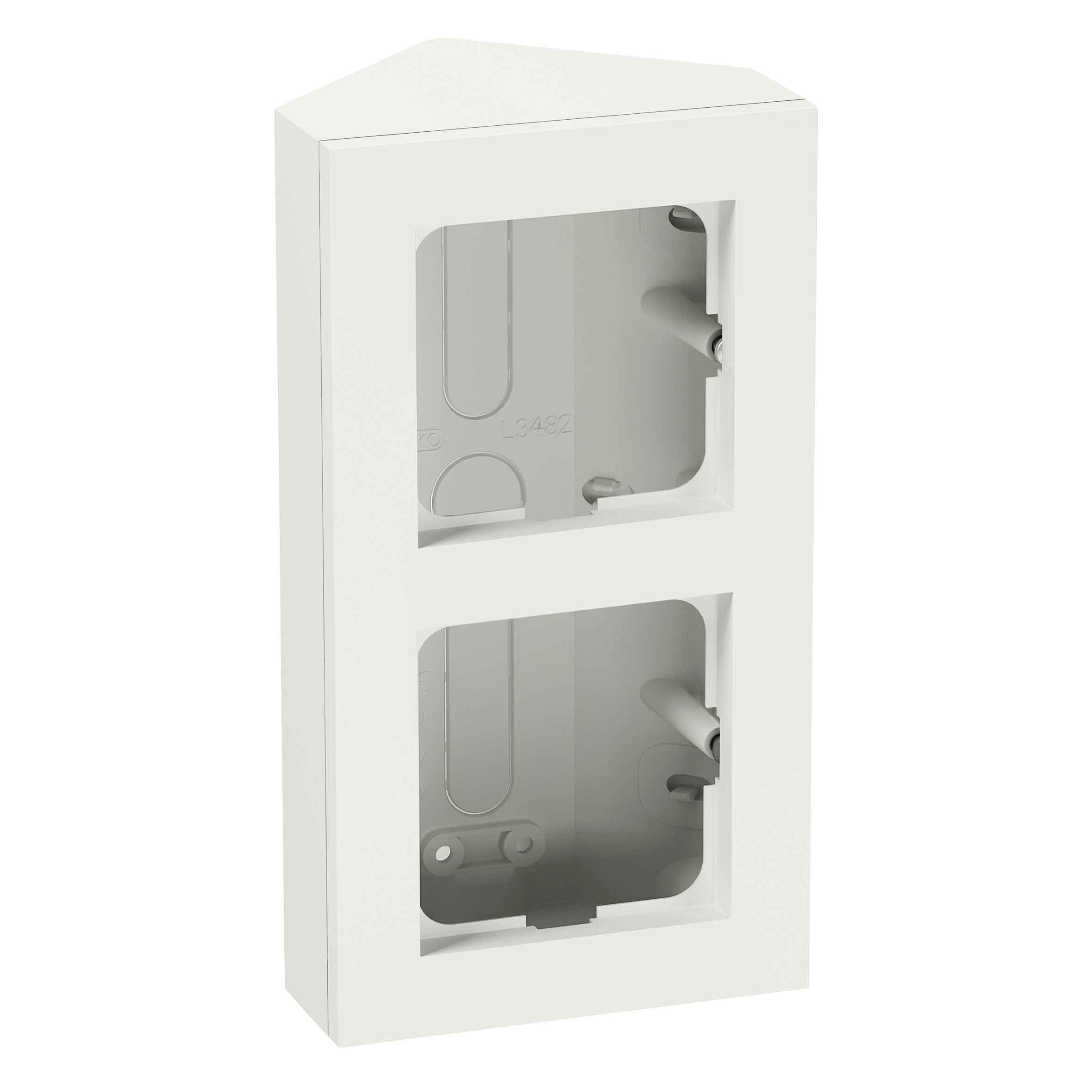 Hörnbox av halogenfri termoplast från Elko. För infällda strömställare, kombinationsuttag och svagströmsapparater i PLUS-serien, när montage i hörn eller under köksskåp önskas. Kan även monteras på bordsskiva eftersom täckplatta för baksidan ingår. Levereras komplett med kombinationsram. Som tillbehör finns även dragavlastare, E18 414 99.