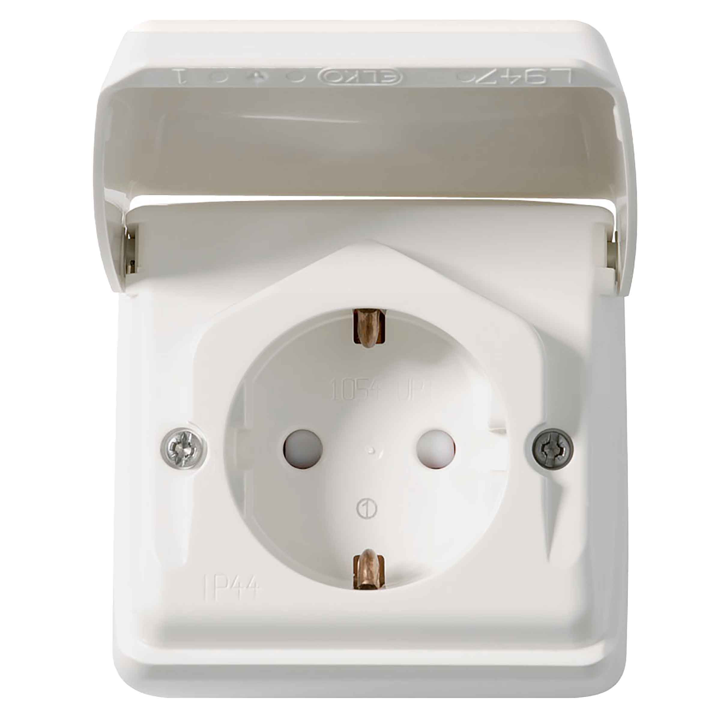 Vägguttag av halogenfri termoplast från Elko. Hel bottenplatta med ovala fästhål underlättar montaget. Inga nipplar eller tätningar erfordras med denna kapslingsteknik som låter eventuellt vatten rinna igenom utan att komma åt strömförande delar. Kabelinföringar klipps ur varsomhelst efter kapslingens sida med Elkos ursparingstång E16 200 04 eller skäres ur med doskniv E16 233 36.