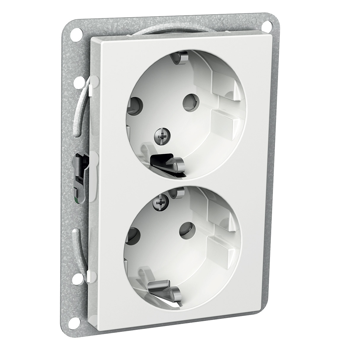 Exxact 2-vägsuttag från Schneider Electrics , låg insats. Bygghöjd ut från vägg är endast 12mm. Jordat, snabbanslutning, petskyddat för infällt montage i 1,5-modul apparatdosa. Med två neutrala överkopplingsklämmor. Kompletteras med valfri Exxact-ram.
