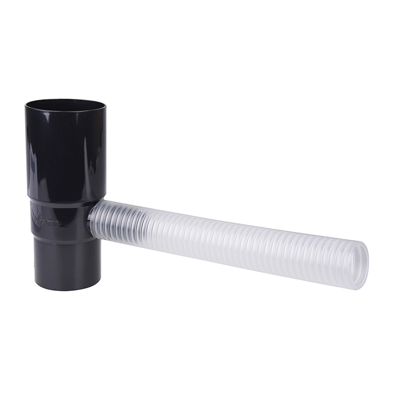 Monteras på stupröret och kopplas till en vattentunna så att vattnet kan samlas upp och återvinnas. Transparent flexrör Ø32mm med skruvgänga - längd ca. 20 cm.