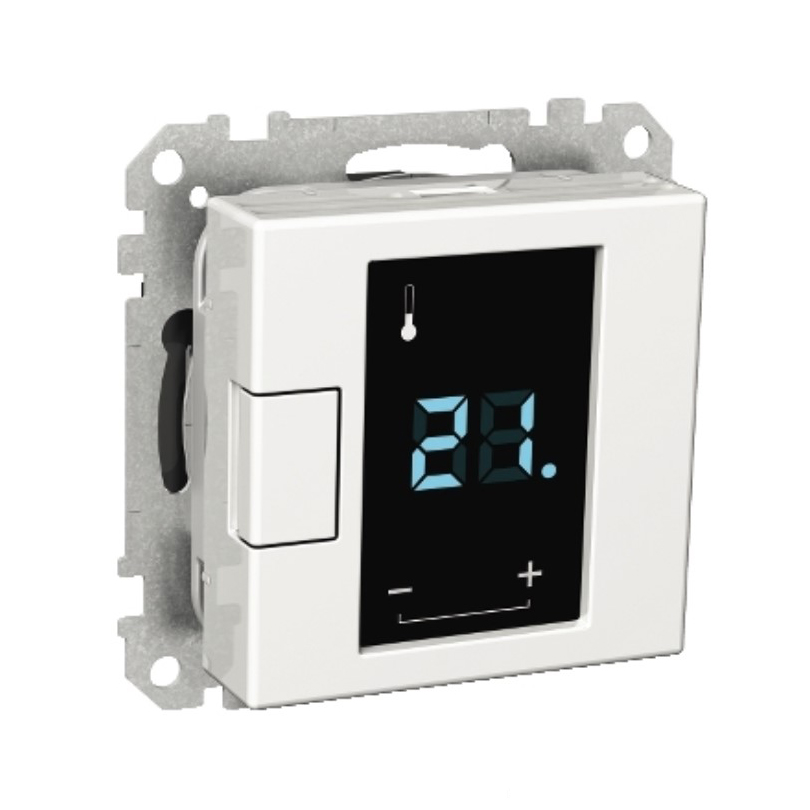 Rum, golv eller båda samtidigt, skruvanslutning.Temperaturområde: rum +5º C till +35º C, golv +5º till +50º C. Skillnad mellan till- och frånslag 1º C. Komletteras med golvgivare. För infällt IP20-montage i apparatdosa c/c 60 mm, för utanpåliggande montage andvänds dosa 35mm. Kompletteras med valfri Exxact-ram.