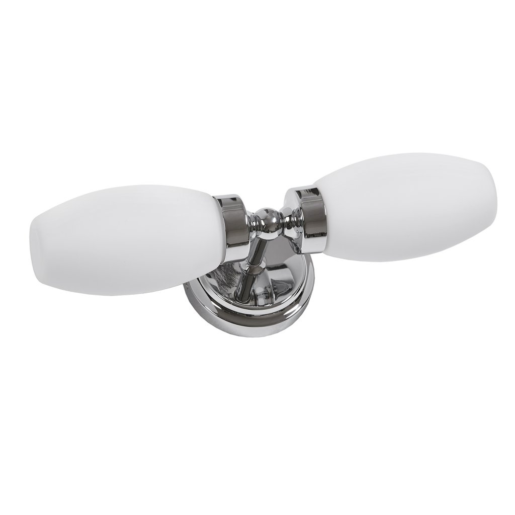 Vägglampa från AH Belysning med två vita droppformade glaskupor.