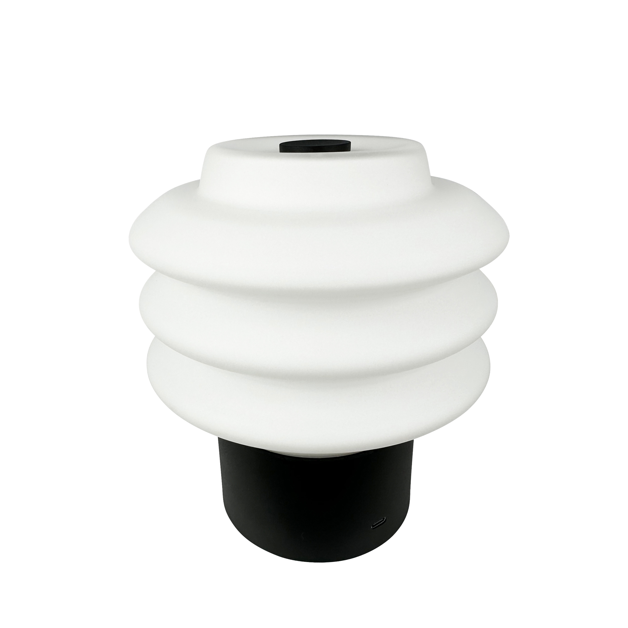 Stilren uppladdningsbar bordslampa med vitt opalglas och kontrasterande svart bas–laddas enkelt med USB-C.