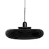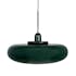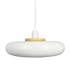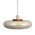 Takpendel i metall med en trädetalj överst på skärmen. Färgad lampskärm ger ett modernt och varmt uttryck i rummet.