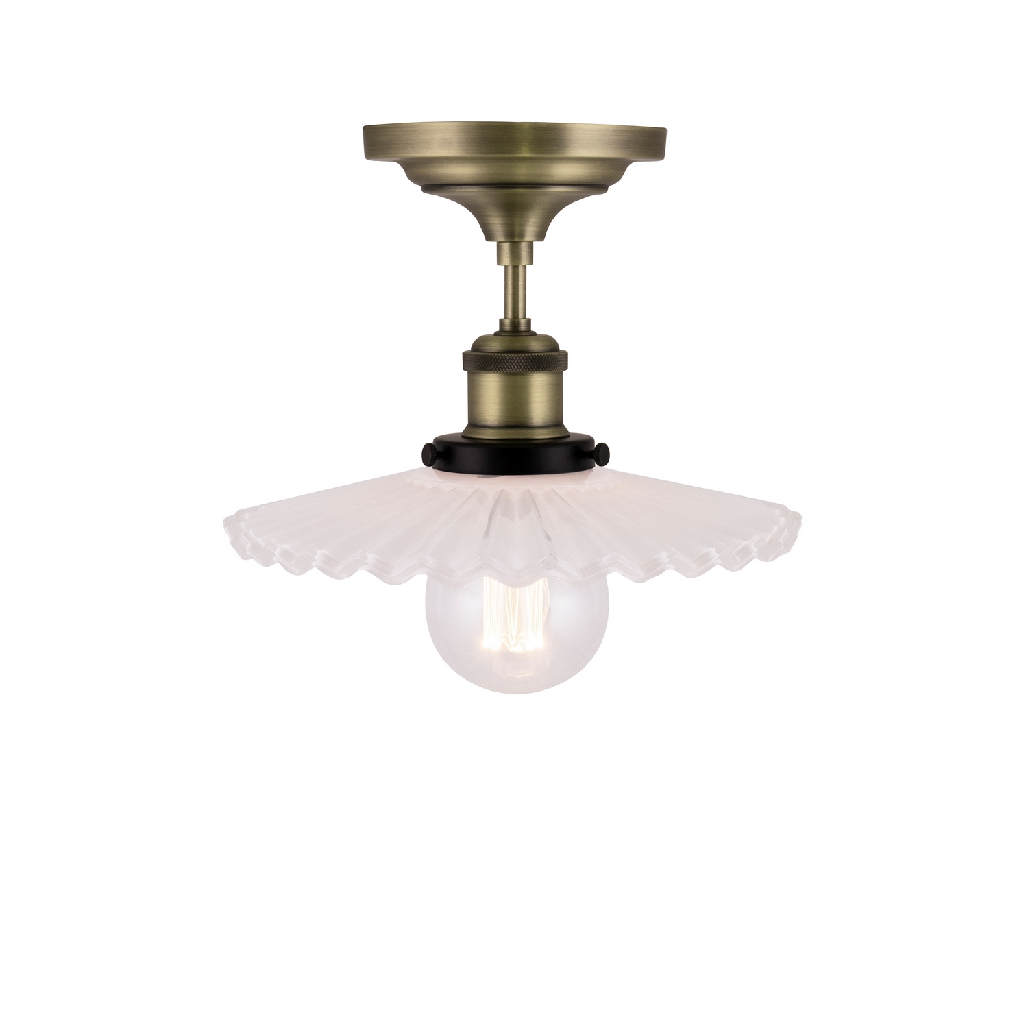 Taklampa Globen Lighting Cobbler 25 Plafond är en sekelskiftsinspirerad liten plafond i skomakarstil med veckat glas och metalldetaljer. Design: GL Design Studio.