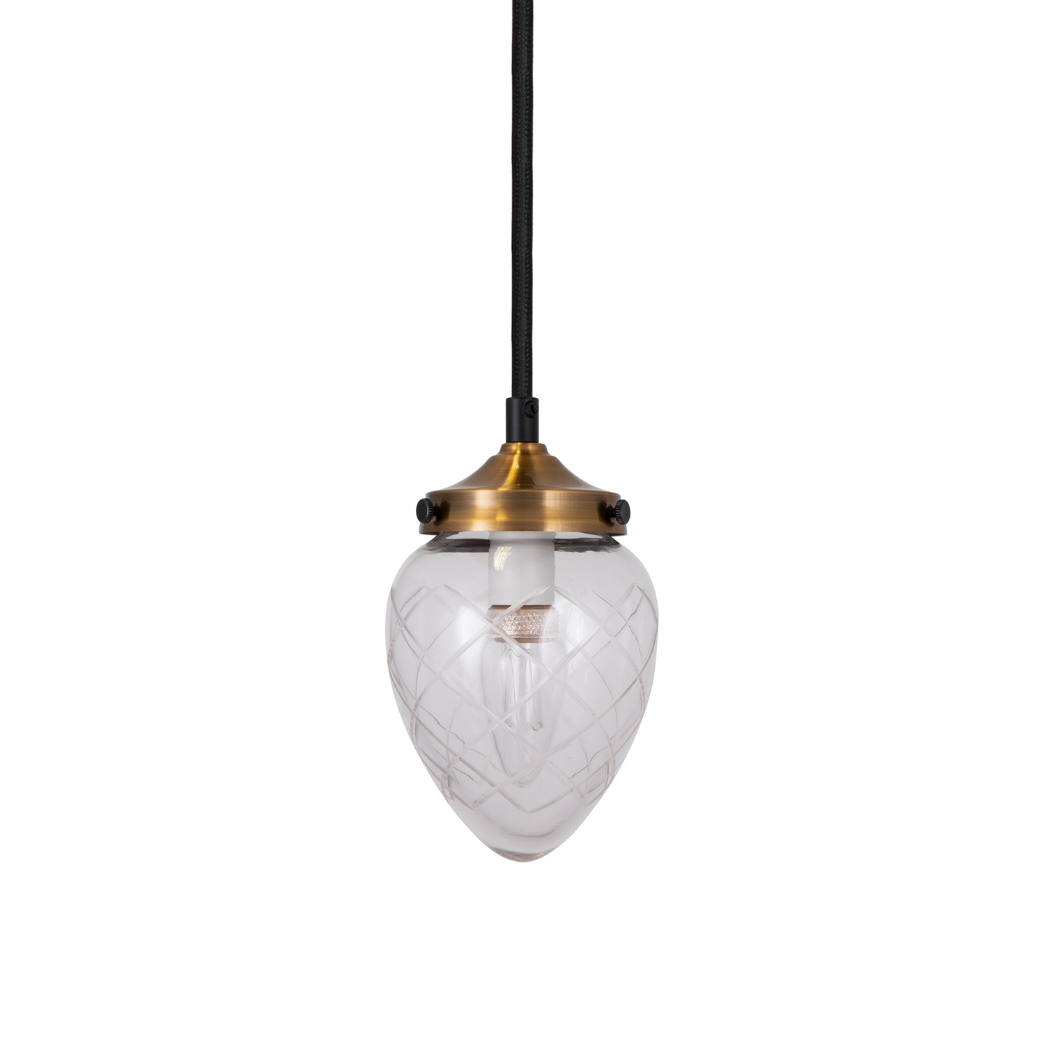 Taklampa Globen Lighting Juni Slipad med sin vackra slipade kupa i glas och borstade mässingsdetaljer i metall för tankarna tillbaka i tiden till tidigt 1900-tal. Hängande i ett fönster i en vacker hall på en herrgård, i en idyllisk svensk småstad. Eller varför inte hänga flera stycken på rad över en köksö? Lampan har en 350 cm lång svart textilkabel med brytare. Design: GL Design Studio.