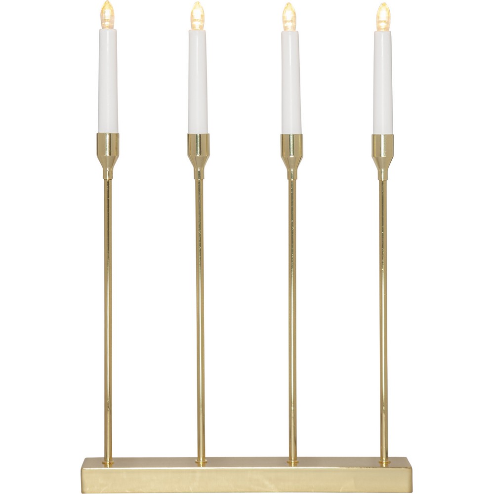 Modern batteri driven adventsljusstake i mässings färg, tillverkad i metall. Perfekt dekoration för platser där inte el är tillgängligt. Ljusstaken är batteridriven. Dekorera med till advent och jul, placera den i ett fönster eller på en skänk.