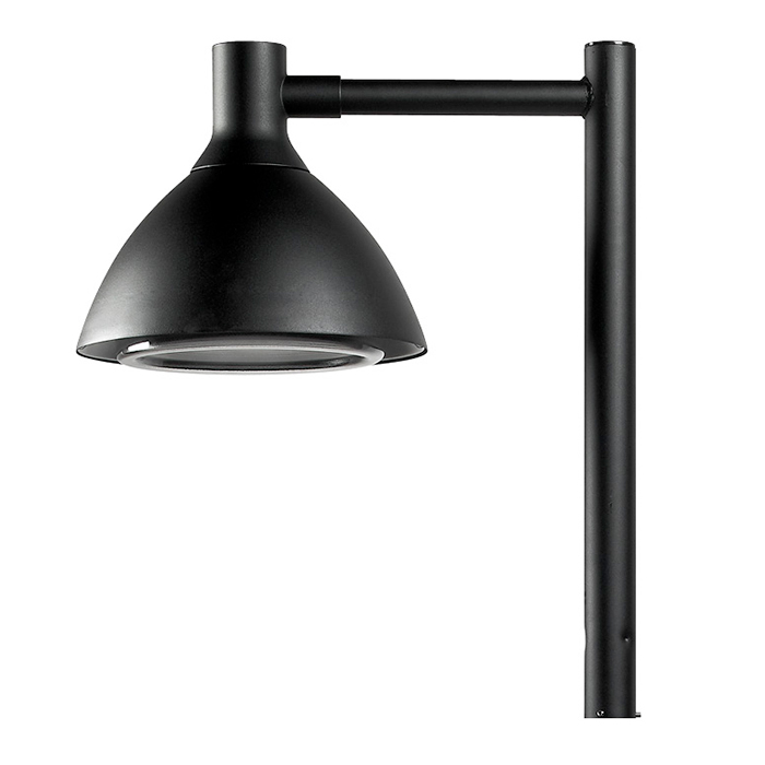 Stolparmatur med avbländat nedljus. Kromaterad och pulverlackerad stomme, bländskydd i PET-G. Armaturen är bestyckad med LED-enheten Philips Fortimo DLM 3000lm. Färgtemperaturen är varmvit (3000K) med en ljusbild som lyser ned.