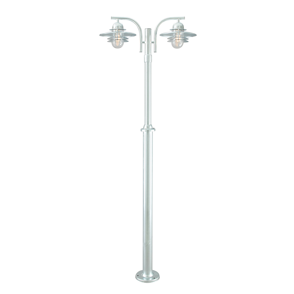 Stolparmatur i galvaniserad eller svartlackerad stålplåt. Teleskoperande. Klar polykarbonatkupa. Olika alternativ på fästanordningar finns som tillbehör. Finns även som vägg och takmodell.