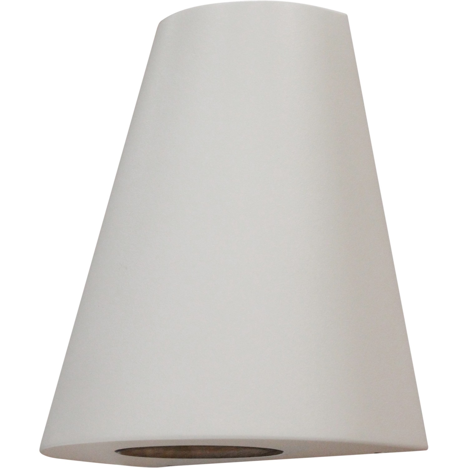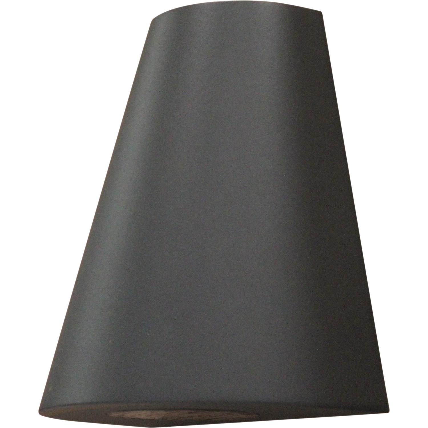 Fasadbelysning i stilfull konformad design i aluminium, med täckglas. Väggarmaturen sprider ljuset nedåt och uppåt. Belysningen passar både på privata fastigheter och i offentlig miljö, och den passar även att använda inomhus. Lampan levereras exklusive ljuskälla. Två ljuskällor med GU10 sockel, max 11W, används i vägglyktan.