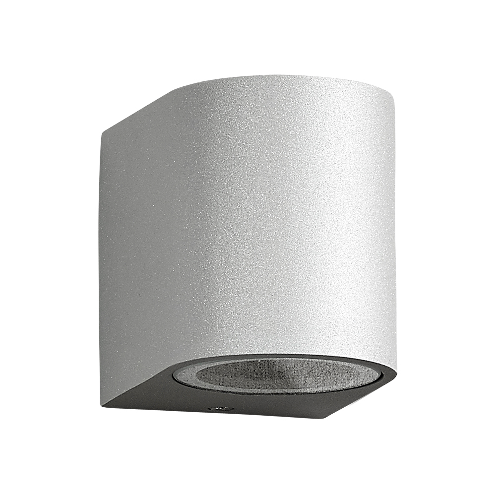 Väggarmatur i formgjuten aluminium med en antikorrosionsbehandlad yta. Pulverlackerad svart alternativt alugrå. Bestyckad med en GU10-sockel (IP54). Nedåtriktad ljus med ett bländskydd i klarglas. För montering på vägg utomhus eller inomhus. Passar för montage med rörutlopp på t.ex. fasader och entréer.