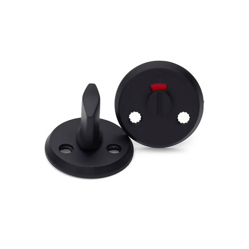 WC-beslag av zink. Levereras med skruvar för genomgående fastsättning. 2 st M5x65 mm tryckeskruvar samt 2 st M5 hylsmuttrar. Passar till dörrtjocklek 38-42 mm. Avsedd för låshus 6414, 62014 och 62020