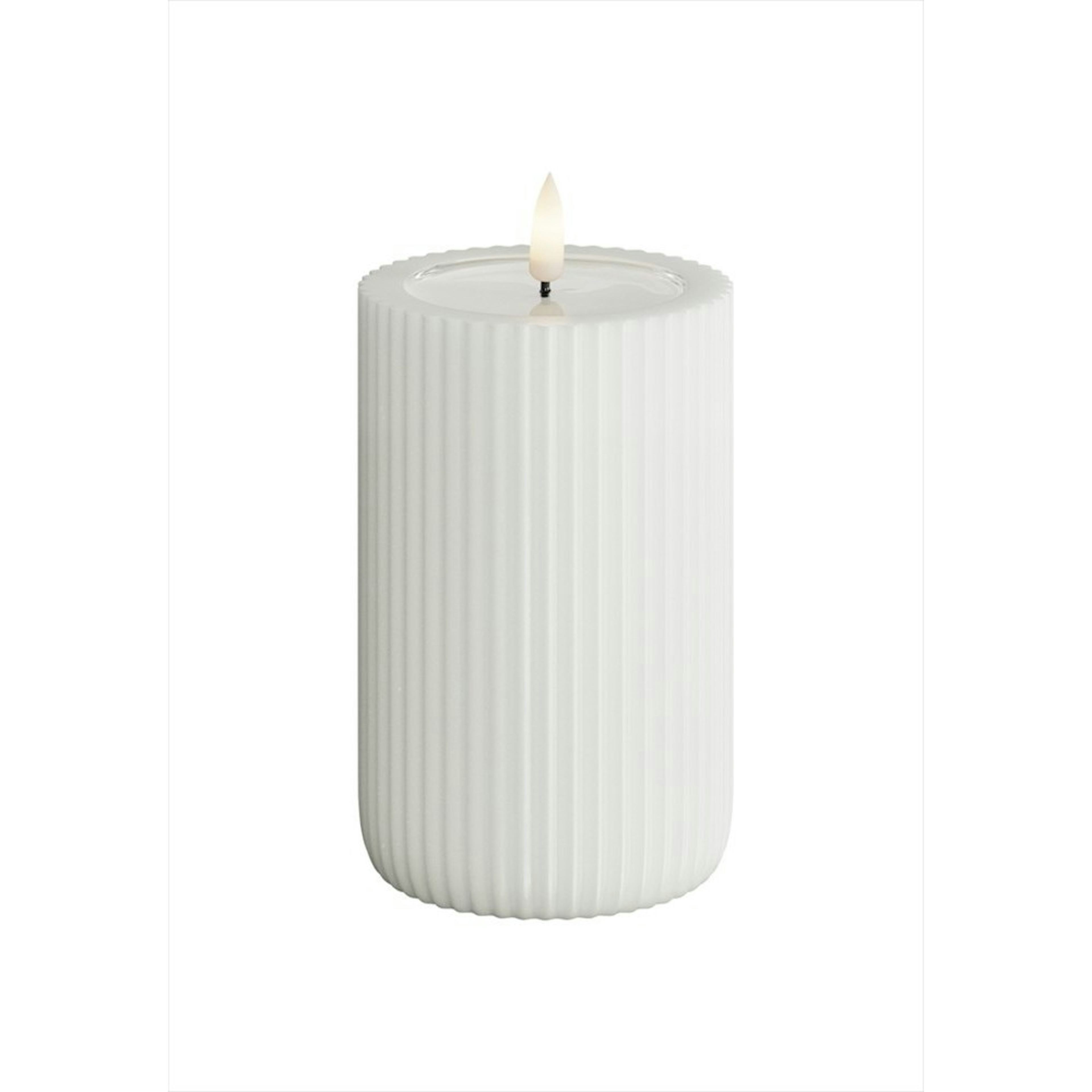 Skapa en elegant och inbjudande atmosfär med detta LED blockljus från UNIQUE Candles. Med sin räfflade yta och subtila creamfärg ger det en sofistikerad känsla till vilket rum som helst. Ljuset ger en verklighetstrogen flammande effekt och ger ett behagligt, varmt sken – perfekt för inomhusbruk där du vill skapa en mysig stämning utan att oroa dig för öppen eld.