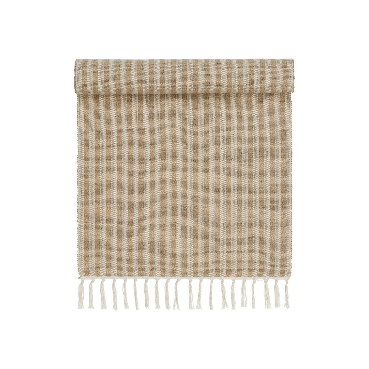 Randig bordlöpare i bomull/jute med kort frans. Storlek 33x120cm exklusive frans. Produkten är certifierad enligt STANDARD 100 by OEKO-TEX®. Certifieringen garanterar att produkten är testad och fri från ämnen som kan vara skadliga för hälsan och miljön.