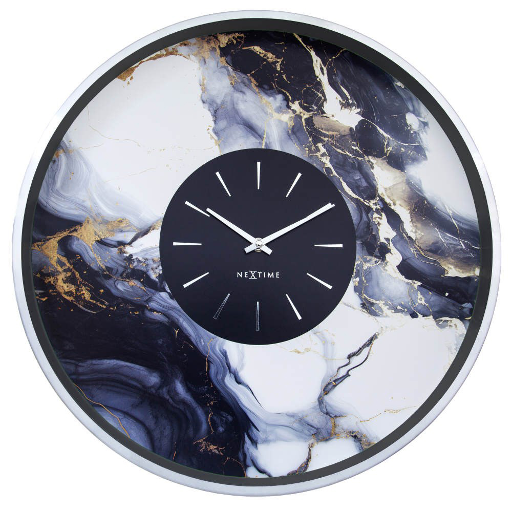 NeXtimes väggklocka Marble Duo personifierar lyx. Det naturligt eleganta marmormönstret står i kontrast till de skimrande guldindexen och skapar ett harmonisk intryck som passar i både moderna och klassiska interiörer. Väggklockan är tystgående och designad för dem som uppskattar livets finare ting.