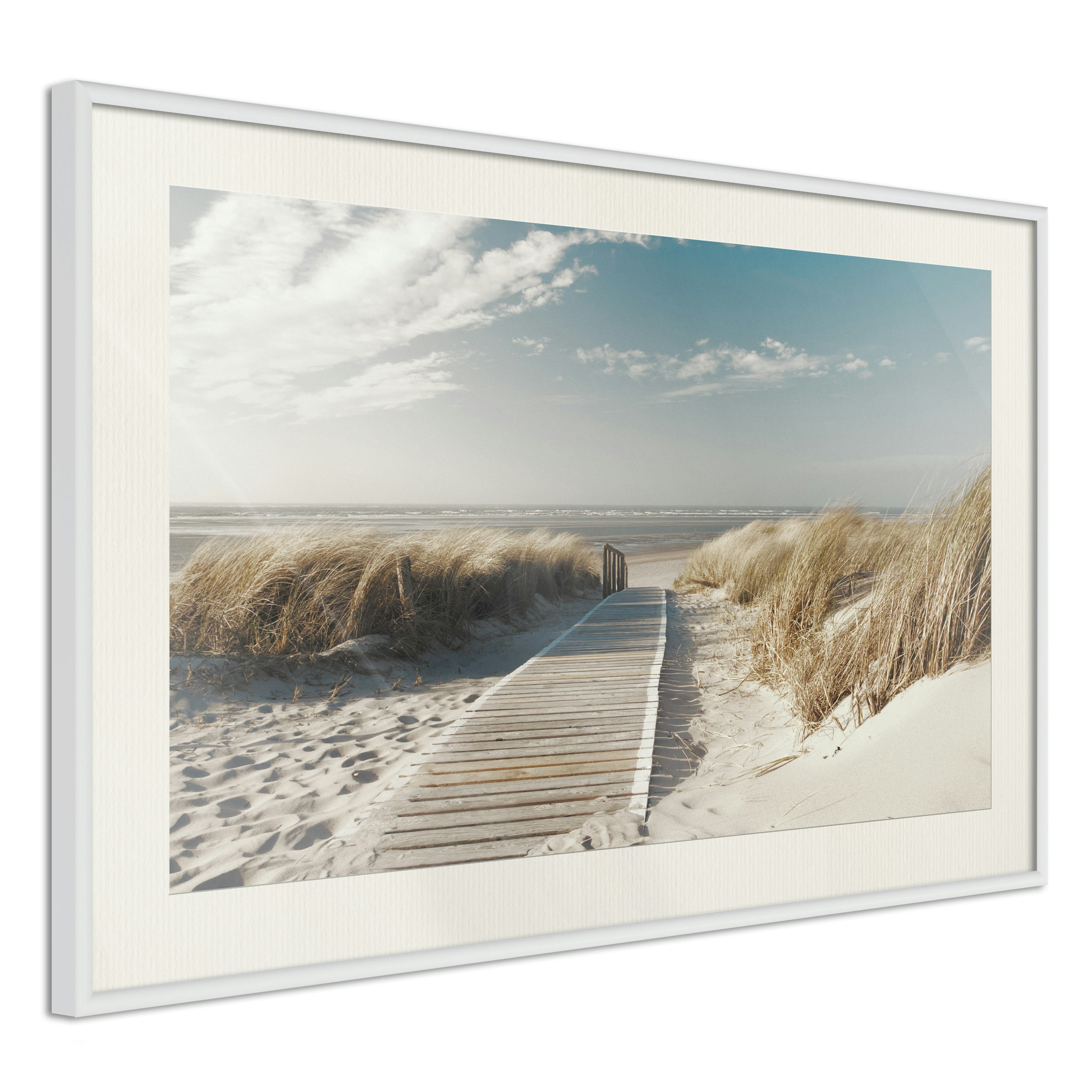 Passepartouten i écru betonar färgern på affischen och skapar en extra kontrast mellan grafiken, ramen och väggen. Dessutom ger den ramen ett svagt tredimensionellt intryck och fungerar även som ett skyddslager som ytterligare skyddar afischen. Affischen är säkrad med akrylglas och en hänganordning finns på ramens baksida.