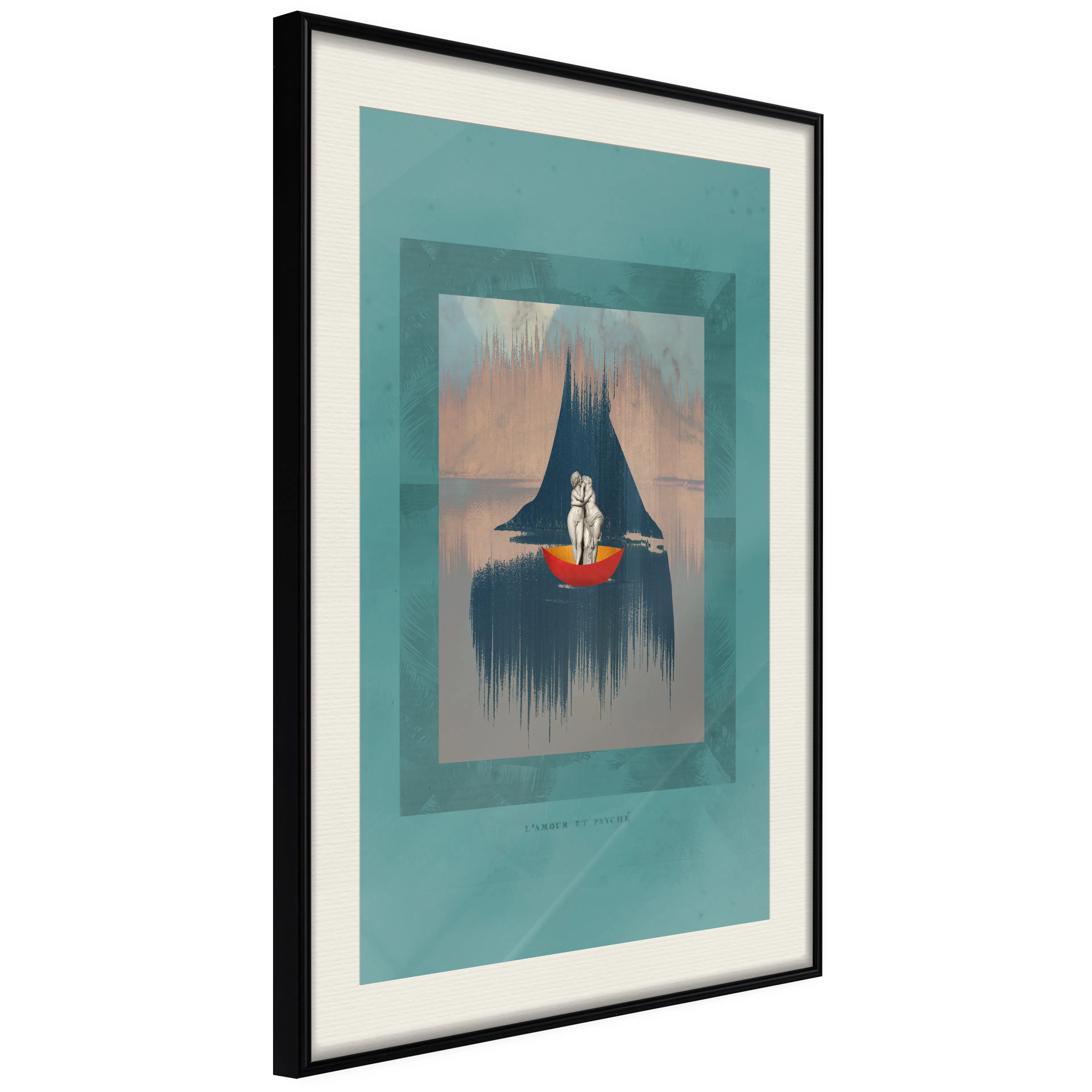 Passepartouten i écru betonar färgern på affischen och skapar en extra kontrast mellan grafiken, ramen och väggen. Dessutom ger den ramen ett svagt tredimensionellt intryck och fungerar även som ett skyddslager som ytterligare skyddar afischen. Affischen är säkrad med akrylglas och en hänganordning finns på ramens baksida.