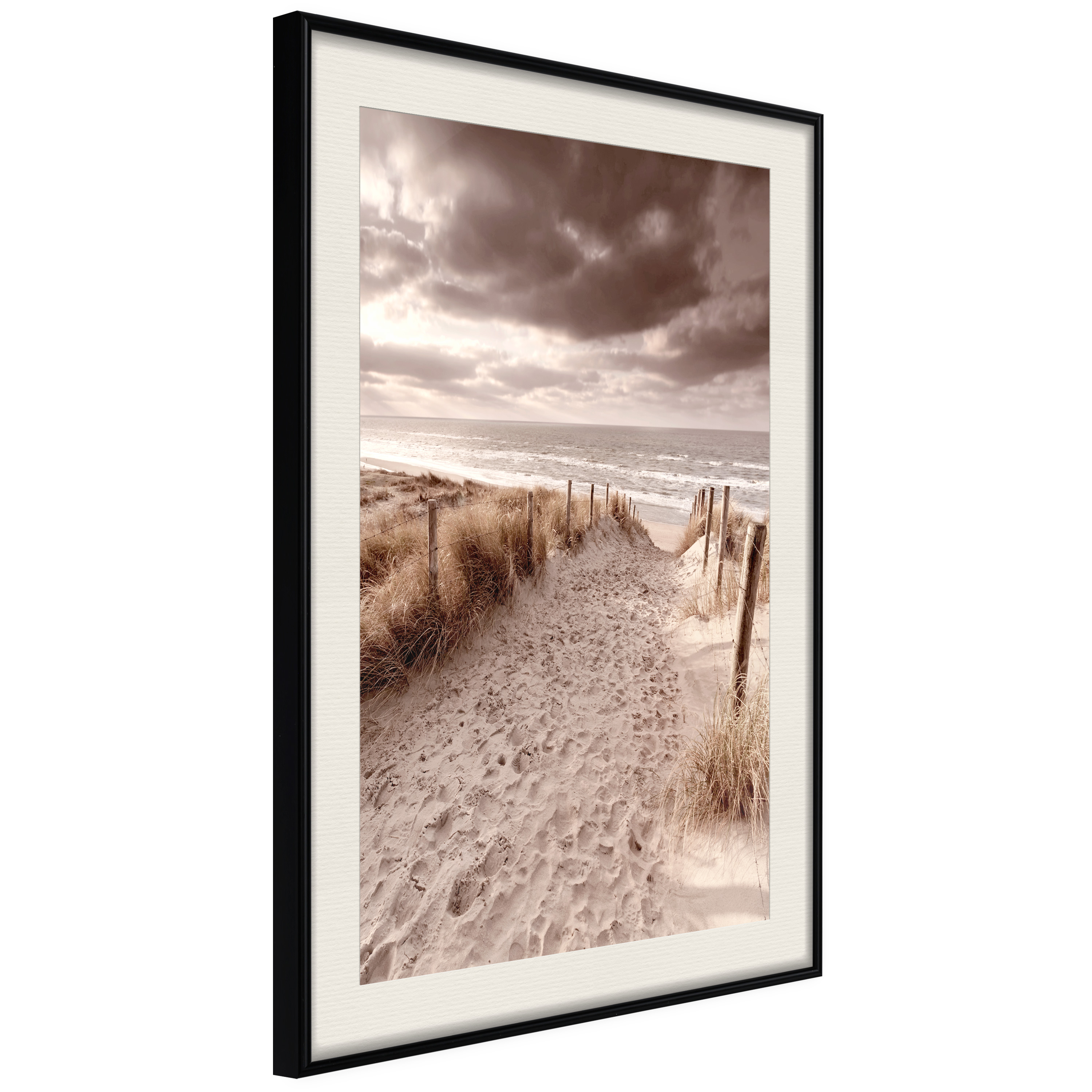 Passepartouten i écru betonar färgern på affischen och skapar en extra kontrast mellan grafiken, ramen och väggen. Dessutom ger den ramen ett svagt tredimensionellt intryck och fungerar även som ett skyddslager som ytterligare skyddar afischen. Affischen är säkrad med akrylglas och en hänganordning finns på ramens baksida.