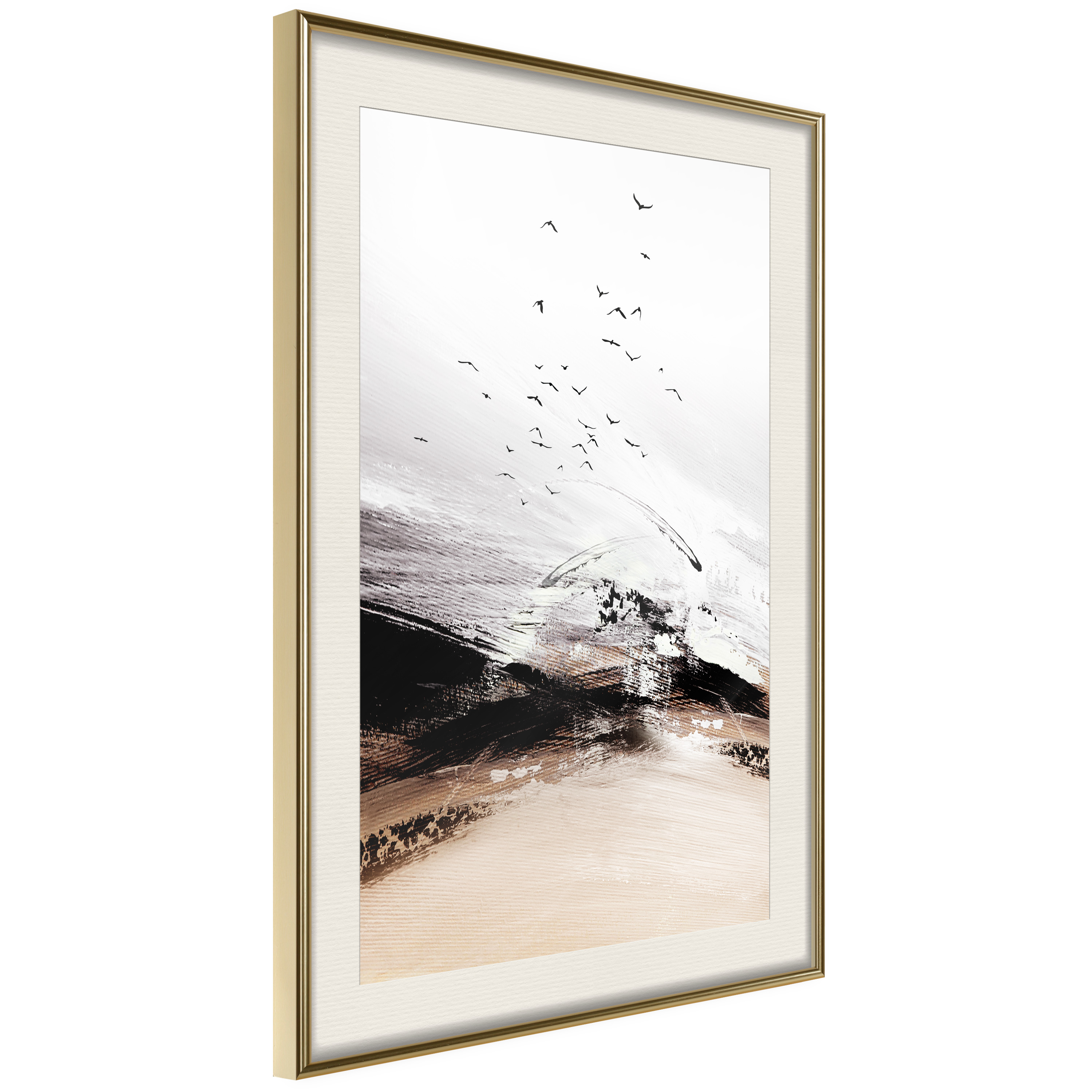 Passepartouten i écru betonar färgern på affischen och skapar en extra kontrast mellan grafiken, ramen och väggen. Dessutom ger den ramen ett svagt tredimensionellt intryck och fungerar även som ett skyddslager som ytterligare skyddar afischen. Affischen är säkrad med akrylglas och en hänganordning finns på ramens baksida.