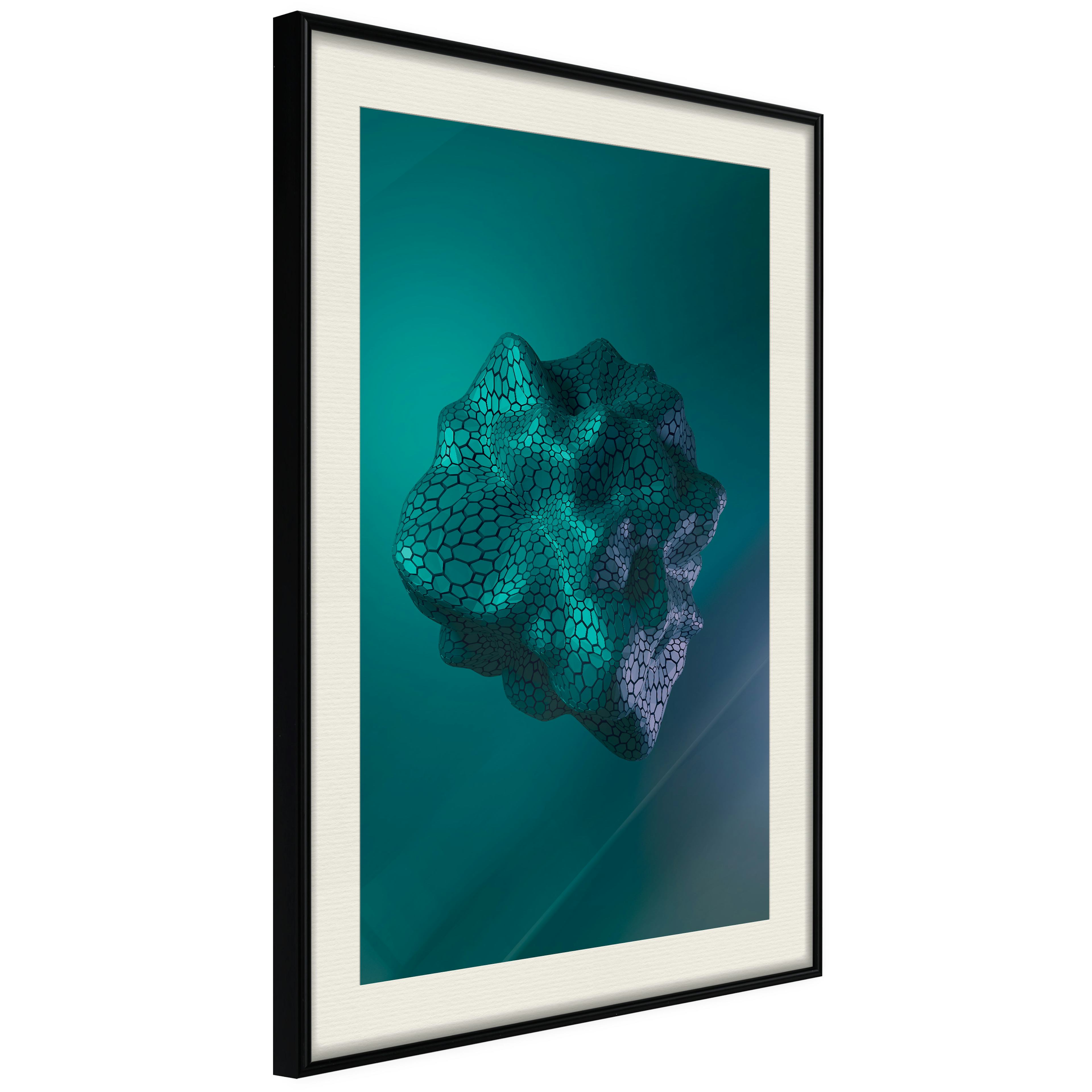 Passepartouten i écru betonar färgern på affischen och skapar en extra kontrast mellan grafiken, ramen och väggen. Dessutom ger den ramen ett svagt tredimensionellt intryck och fungerar även som ett skyddslager som ytterligare skyddar afischen. Affischen är säkrad med akrylglas och en hänganordning finns på ramens baksida.