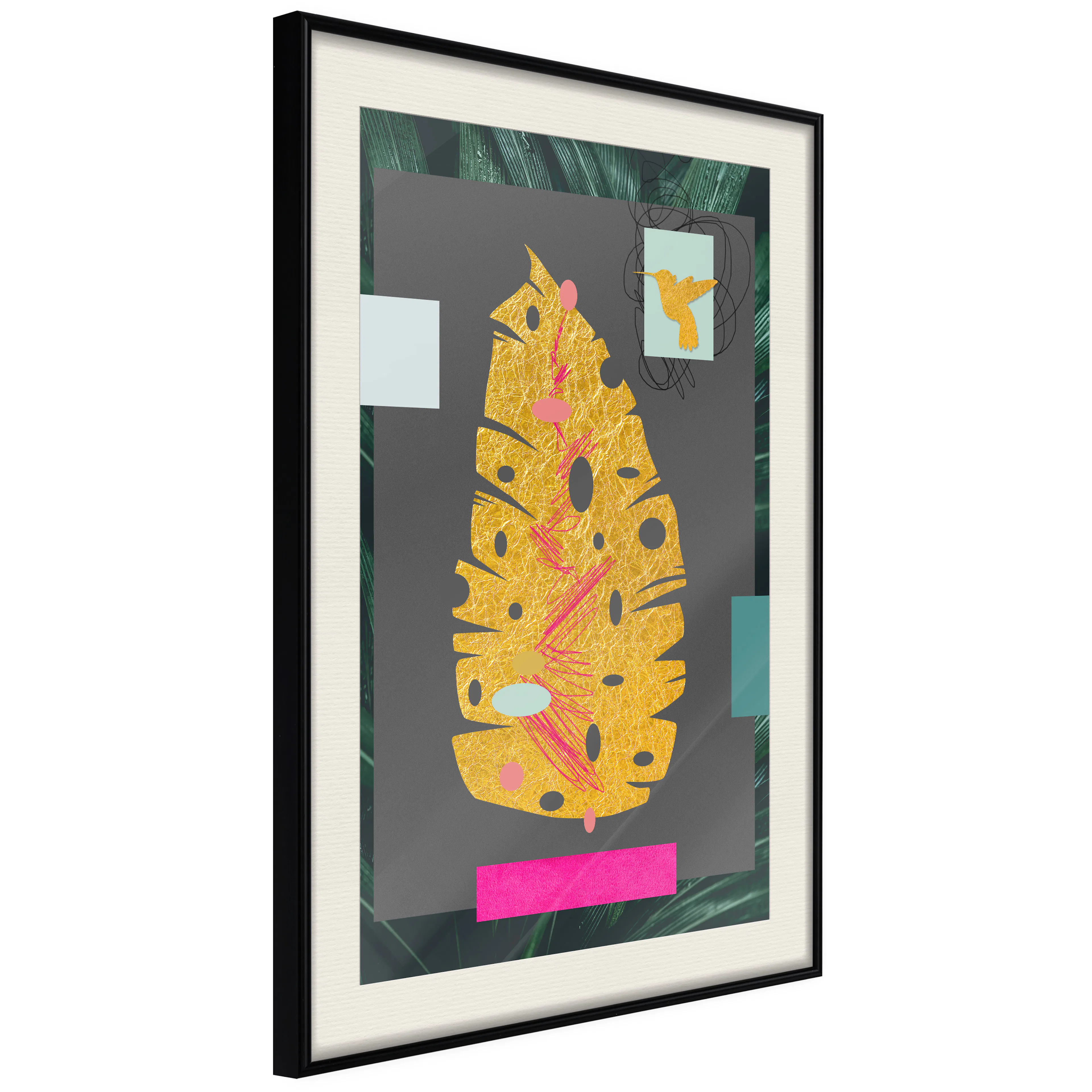 Passepartouten i écru betonar färgern på affischen och skapar en extra kontrast mellan grafiken, ramen och väggen. Dessutom ger den ramen ett svagt tredimensionellt intryck och fungerar även som ett skyddslager som ytterligare skyddar afischen. Affischen är säkrad med akrylglas och en hänganordning finns på ramens baksida.