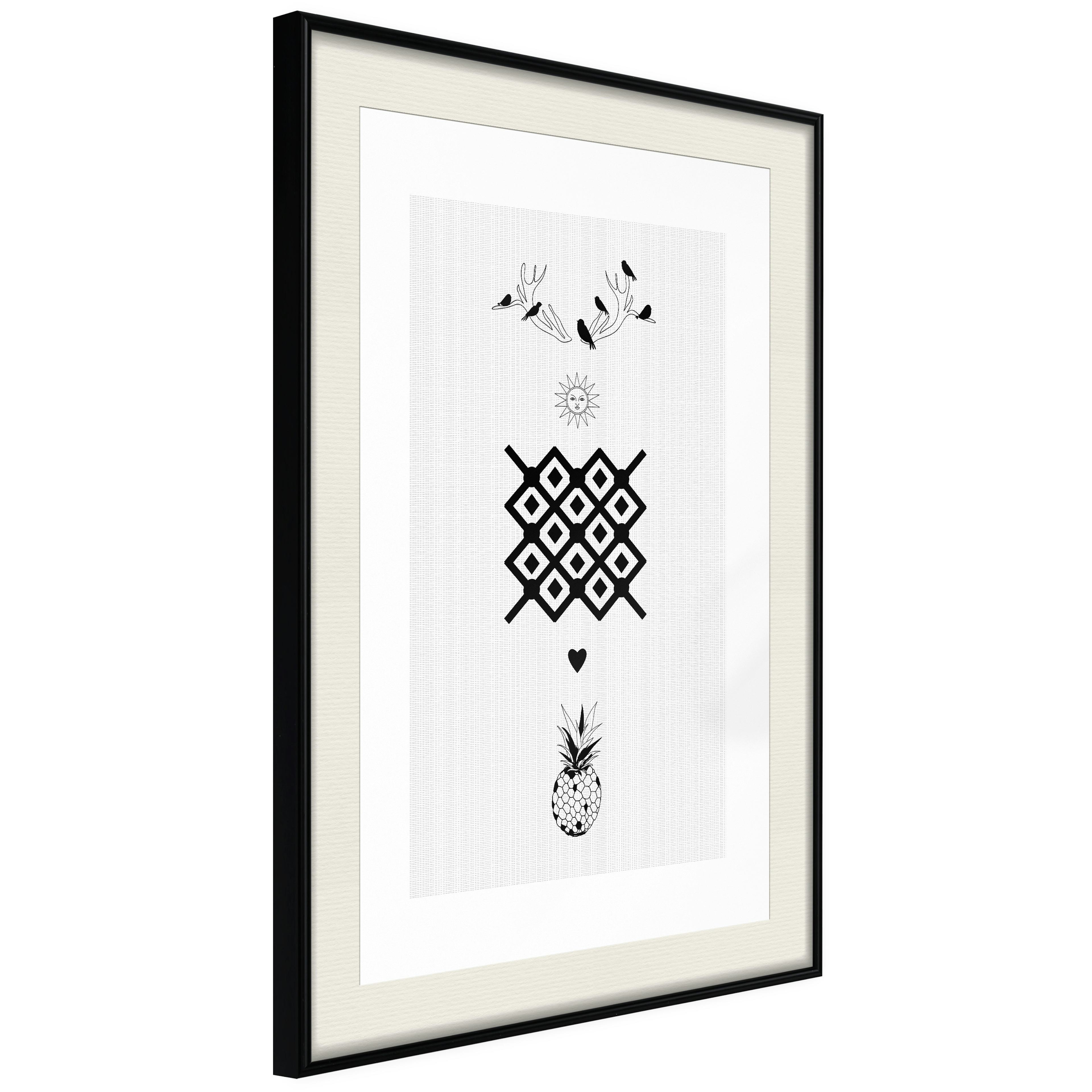 Passepartouten i écru betonar färgern på affischen och skapar en extra kontrast mellan grafiken, ramen och väggen. Dessutom ger den ramen ett svagt tredimensionellt intryck och fungerar även som ett skyddslager som ytterligare skyddar afischen. Affischen är säkrad med akrylglas och en hänganordning finns på ramens baksida.