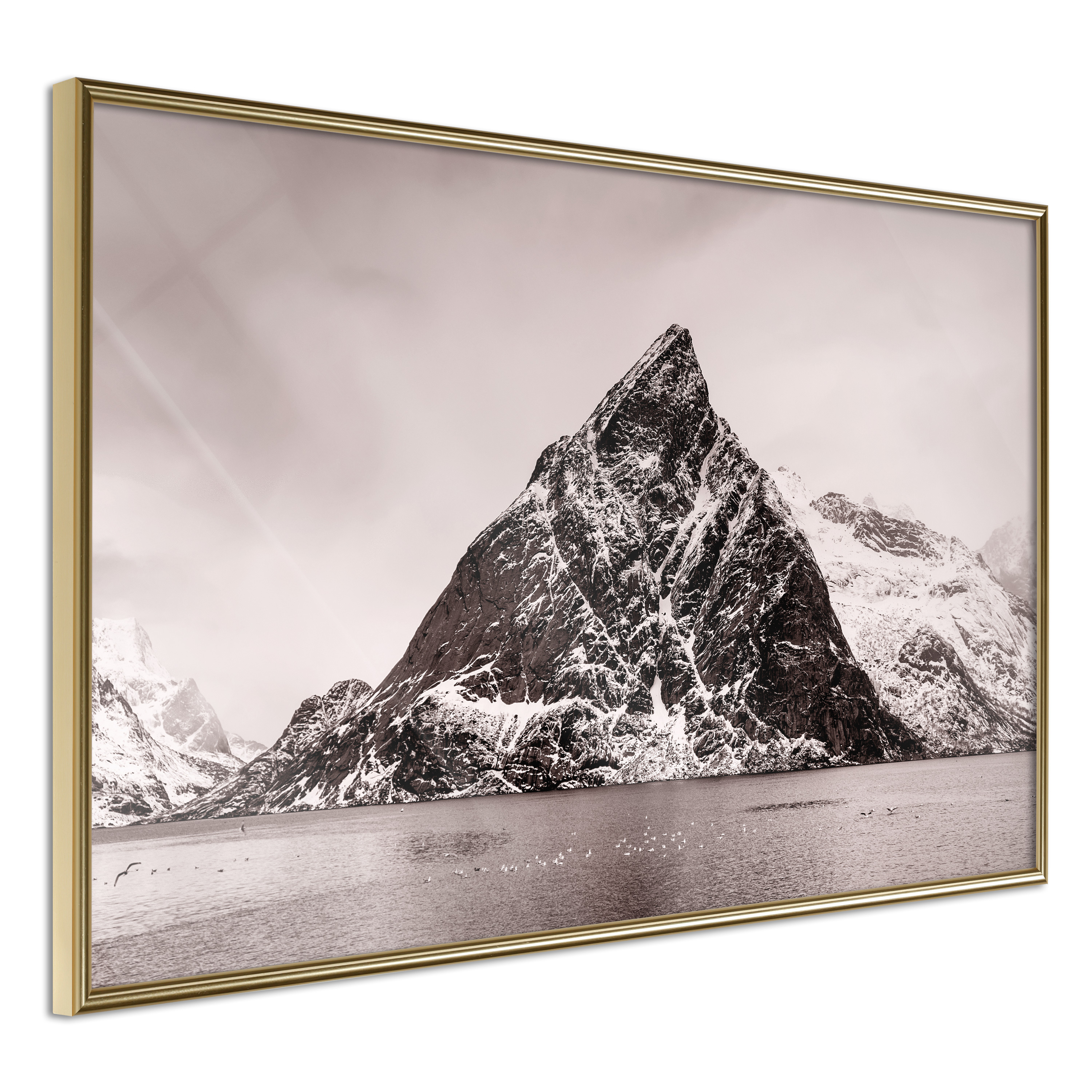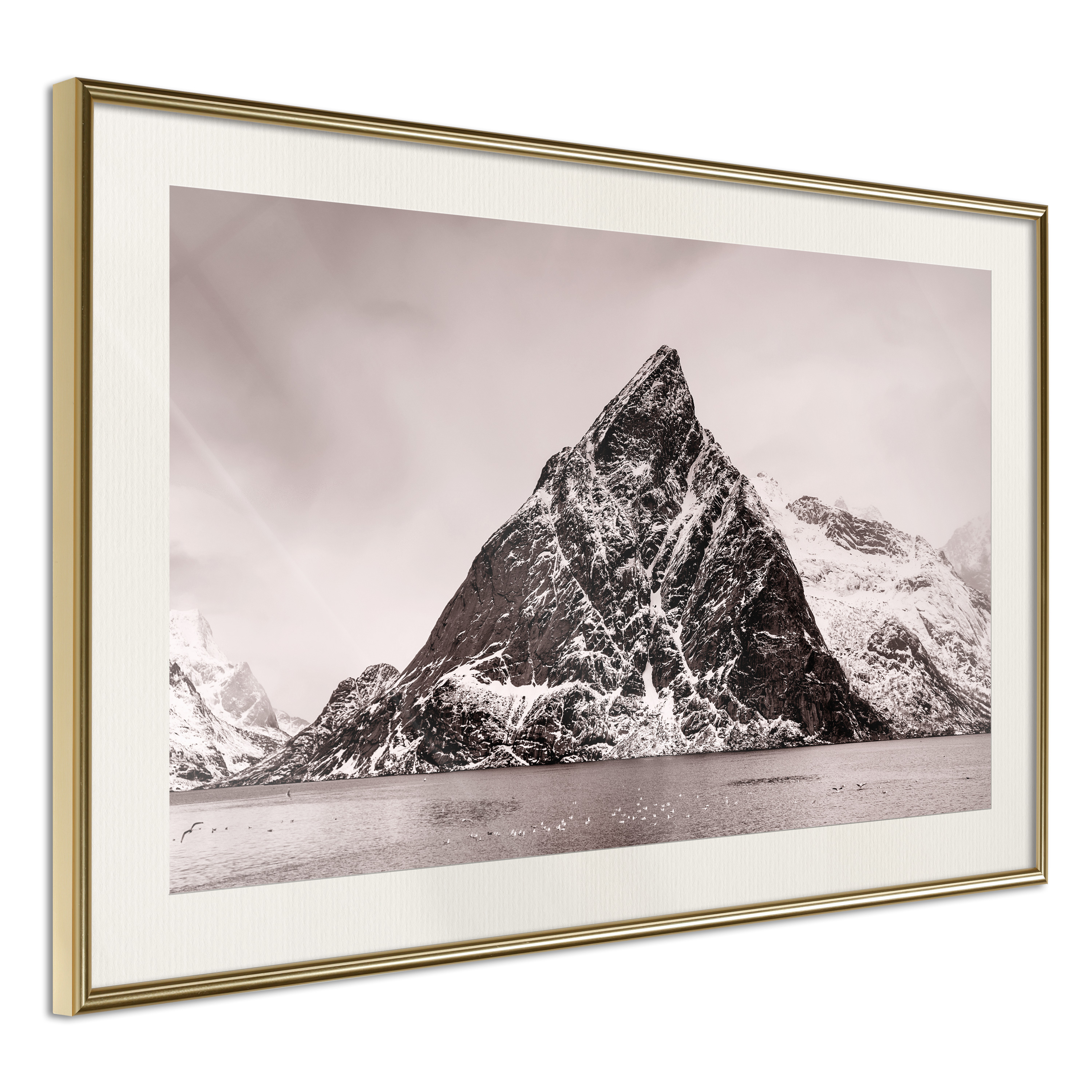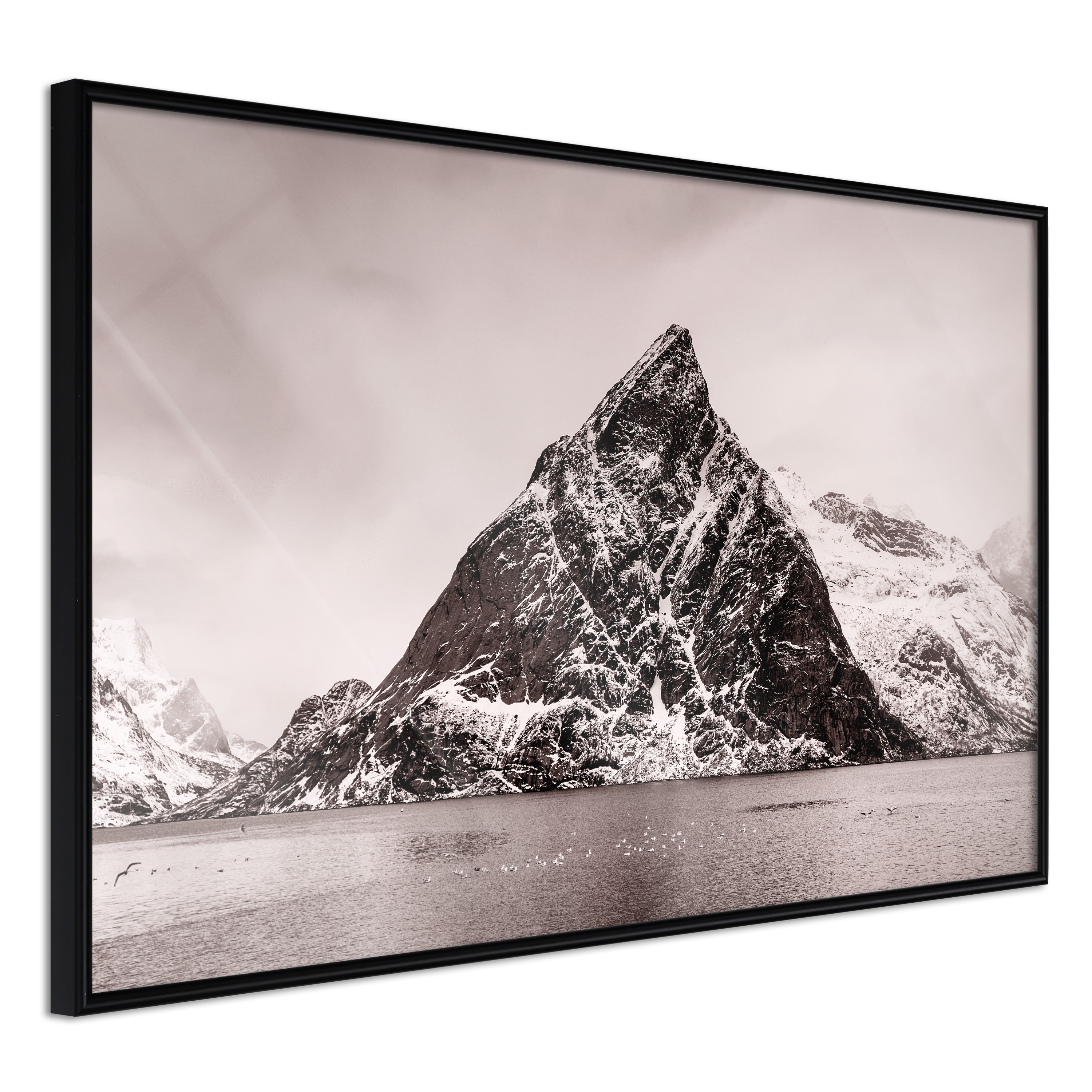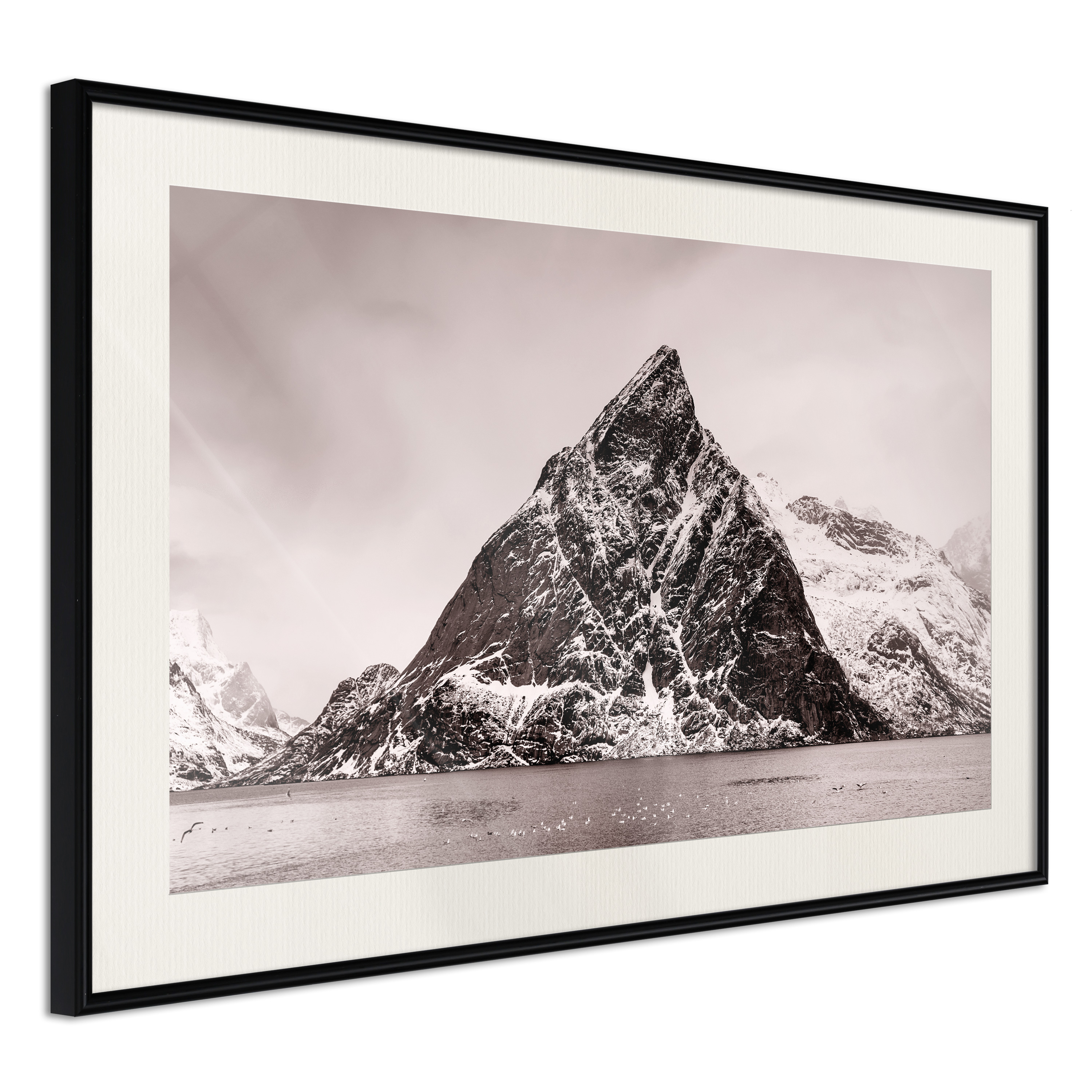 Passepartouten i écru betonar färgern på affischen och skapar en extra kontrast mellan grafiken, ramen och väggen. Dessutom ger den ramen ett svagt tredimensionellt intryck och fungerar även som ett skyddslager som ytterligare skyddar afischen. Affischen är säkrad med akrylglas och en hänganordning finns på ramens baksida.