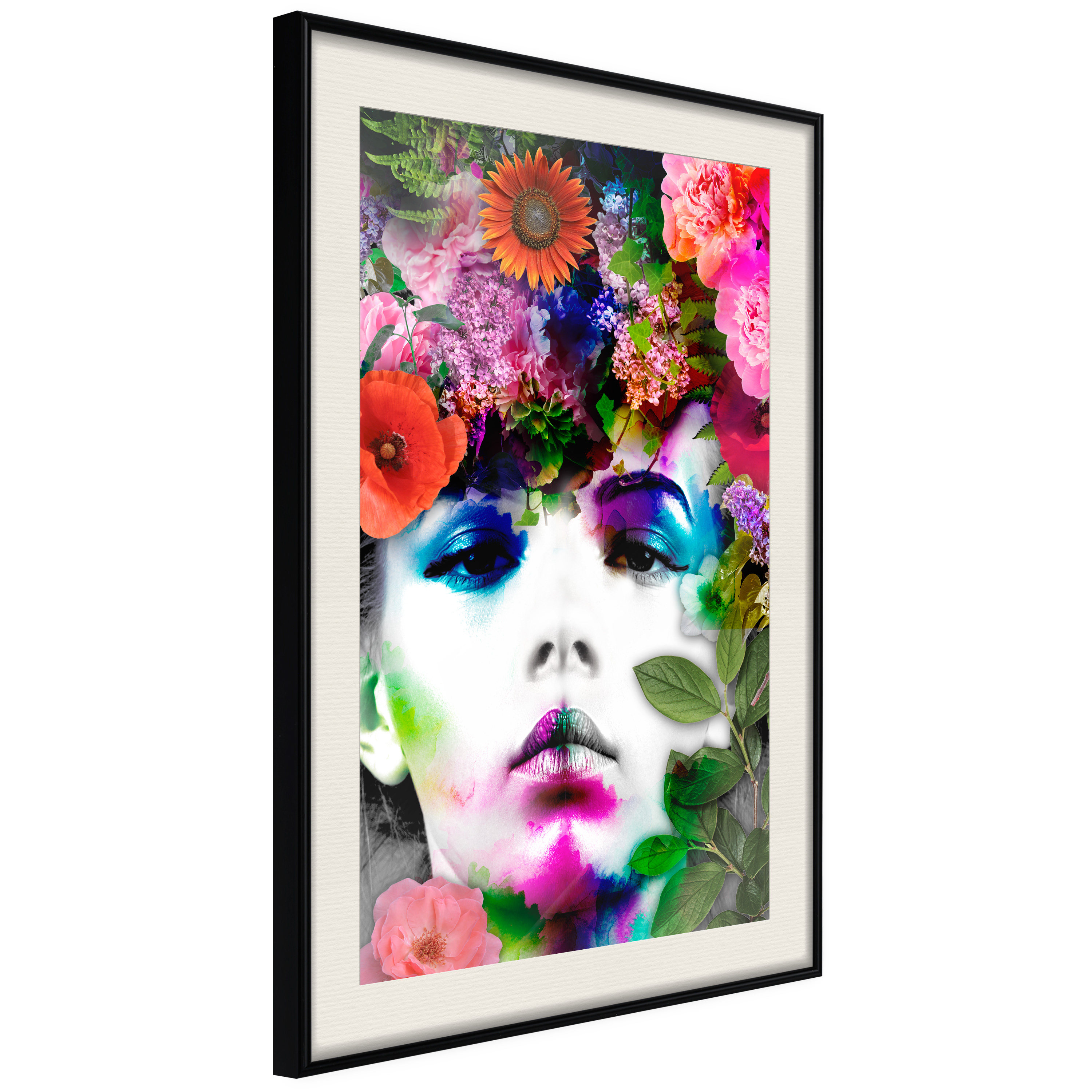 Passepartouten i écru betonar färgern på affischen och skapar en extra kontrast mellan grafiken, ramen och väggen. Dessutom ger den ramen ett svagt tredimensionellt intryck och fungerar även som ett skyddslager som ytterligare skyddar afischen. Affischen är säkrad med akrylglas och en hänganordning finns på ramens baksida.