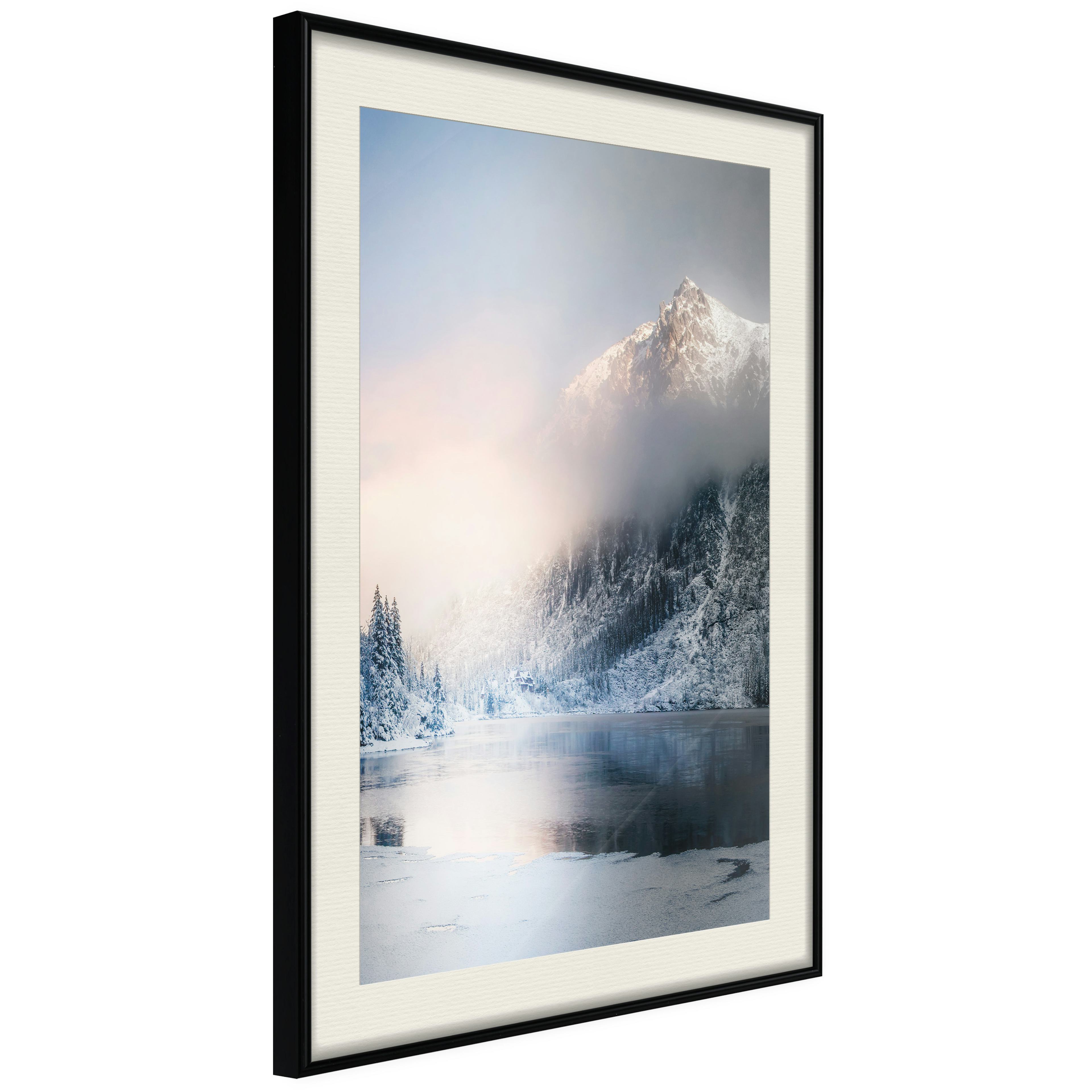 Passepartouten i écru betonar färgern på affischen och skapar en extra kontrast mellan grafiken, ramen och väggen. Dessutom ger den ramen ett svagt tredimensionellt intryck och fungerar även som ett skyddslager som ytterligare skyddar afischen. Affischen är säkrad med akrylglas och en hänganordning finns på ramens baksida.