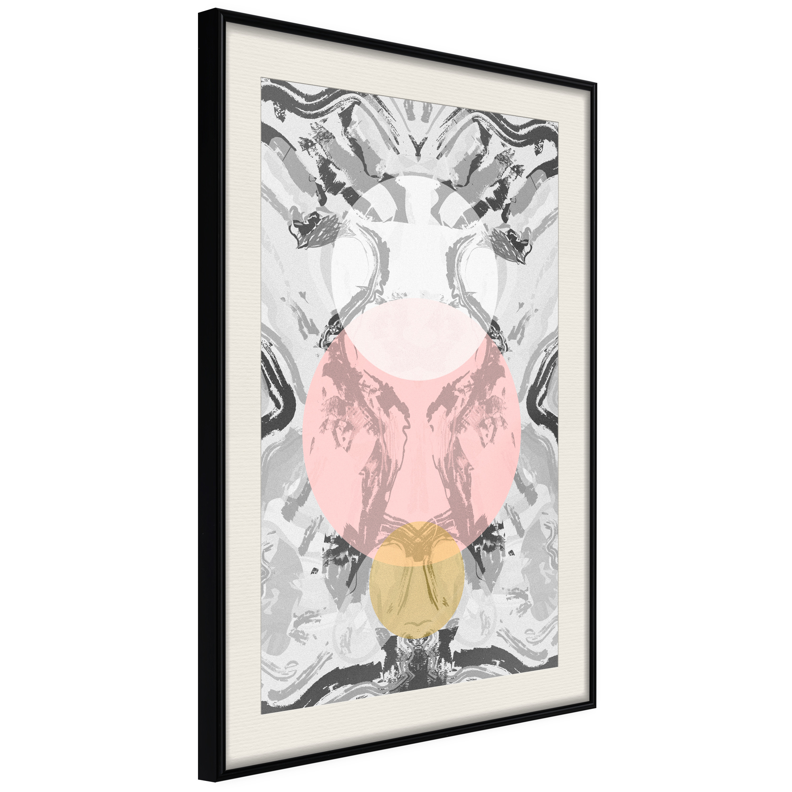 Passepartouten i écru betonar färgern på affischen och skapar en extra kontrast mellan grafiken, ramen och väggen. Dessutom ger den ramen ett svagt tredimensionellt intryck och fungerar även som ett skyddslager som ytterligare skyddar afischen. Affischen är säkrad med akrylglas och en hänganordning finns på ramens baksida.