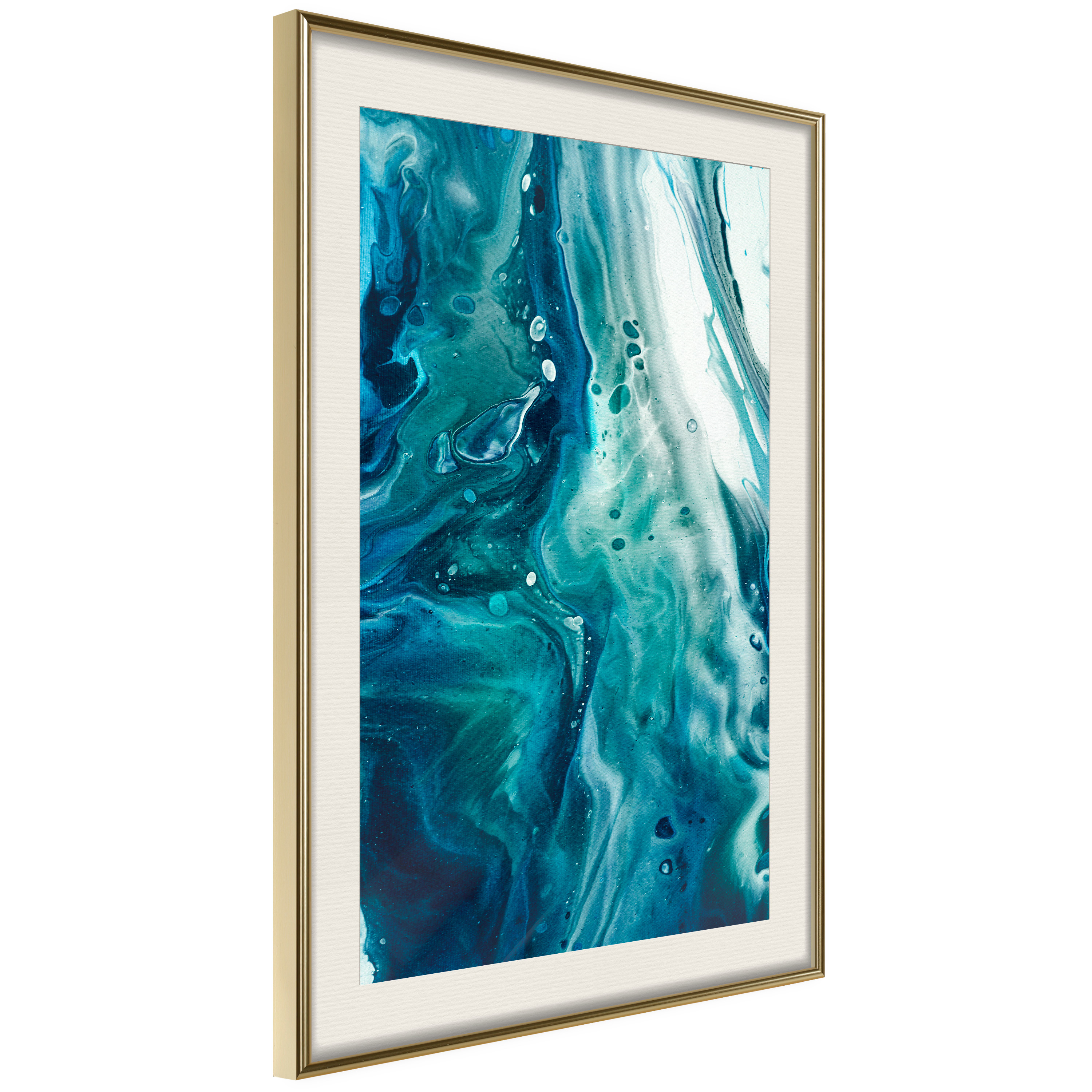 Passepartouten i écru betonar färgern på affischen och skapar en extra kontrast mellan grafiken, ramen och väggen. Dessutom ger den ramen ett svagt tredimensionellt intryck och fungerar även som ett skyddslager som ytterligare skyddar afischen. Affischen är säkrad med akrylglas och en hänganordning finns på ramens baksida.