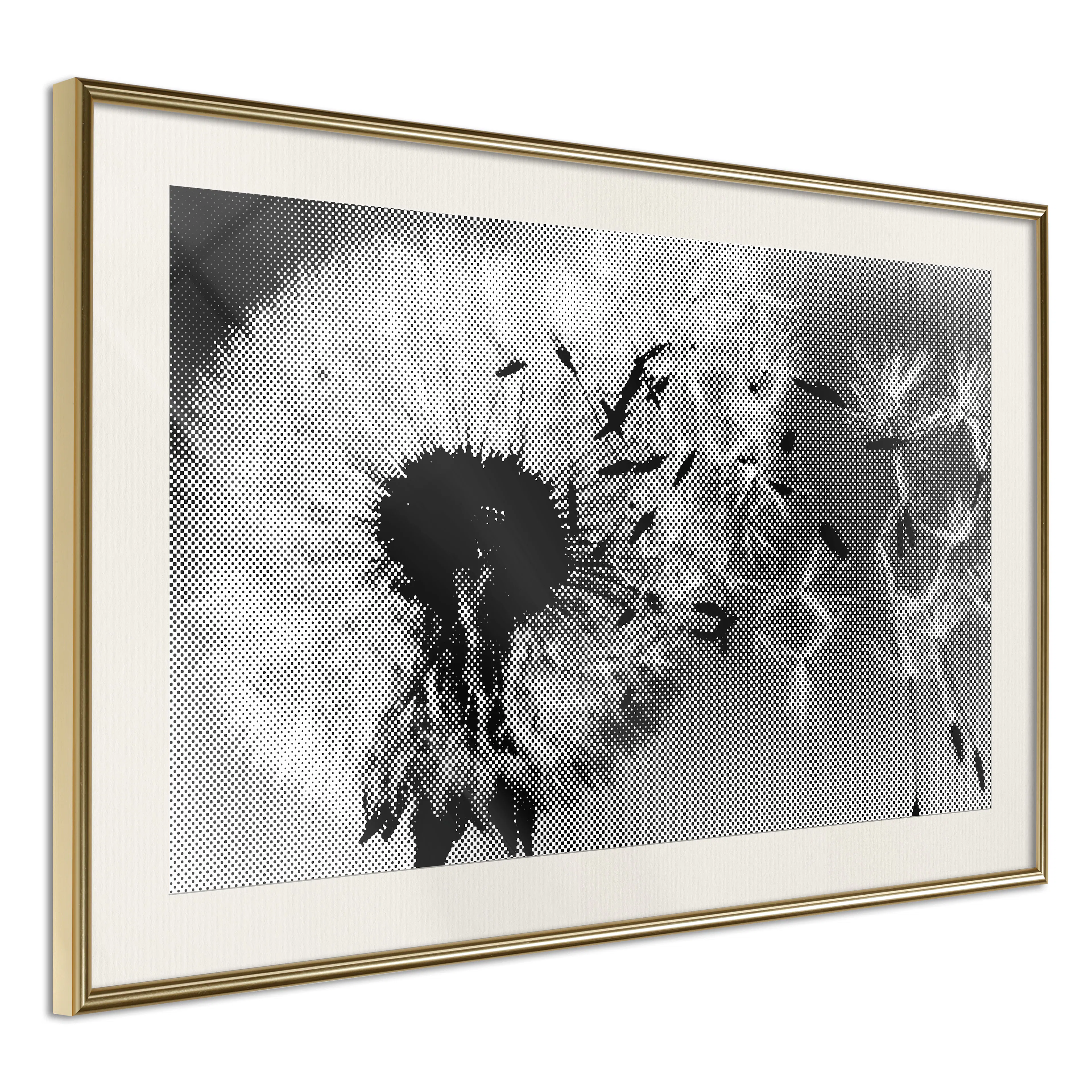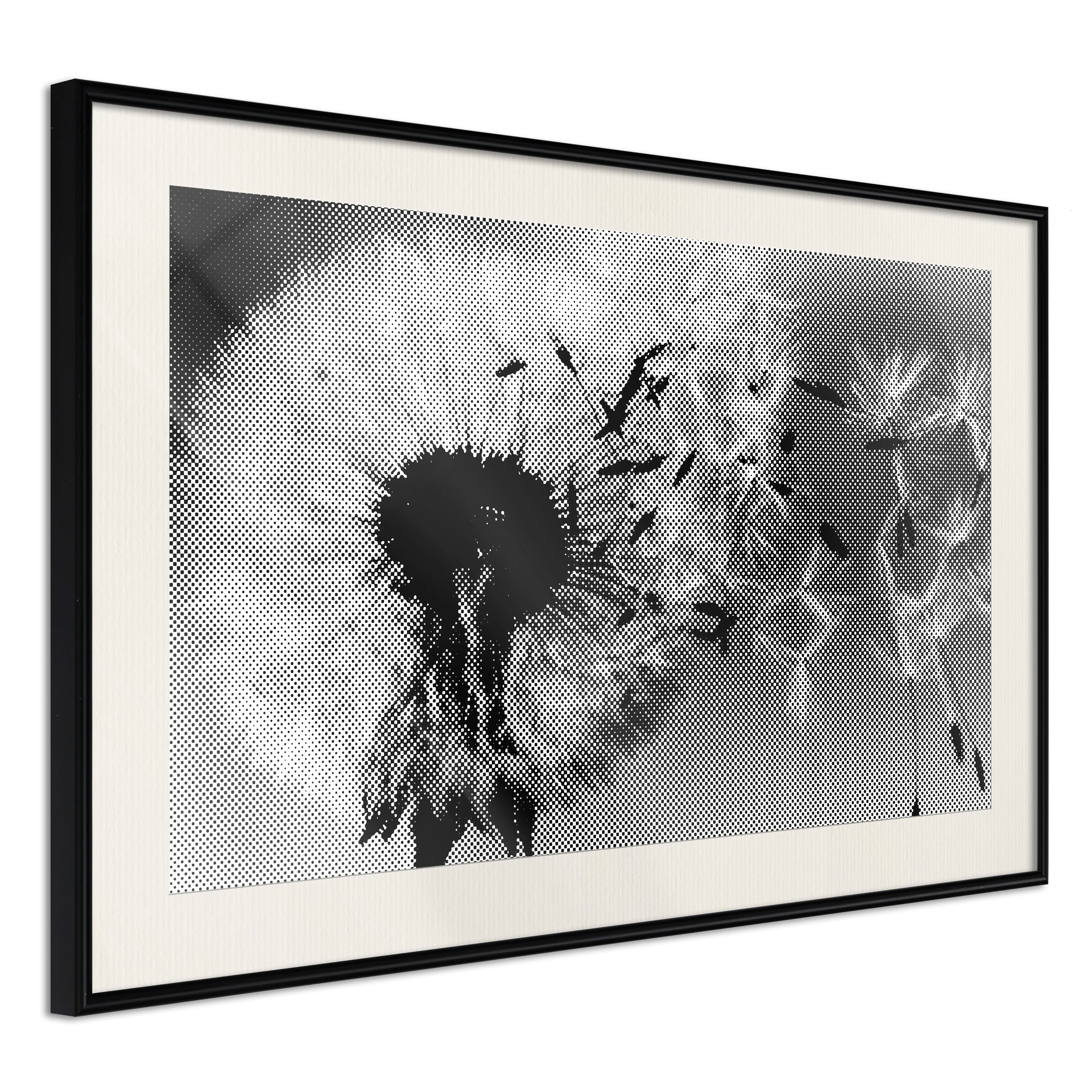 Passepartouten i écru betonar färgern på affischen och skapar en extra kontrast mellan grafiken, ramen och väggen. Dessutom ger den ramen ett svagt tredimensionellt intryck och fungerar även som ett skyddslager som ytterligare skyddar afischen. Affischen är säkrad med akrylglas och en hänganordning finns på ramens baksida.
