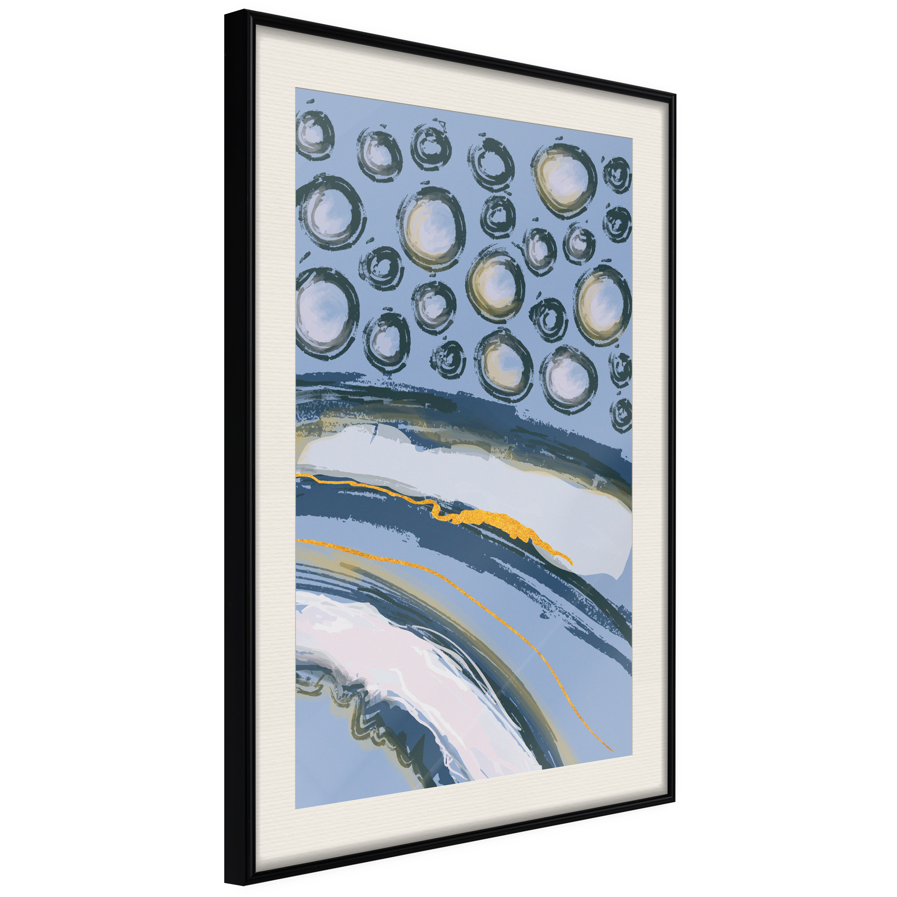 Passepartouten i écru betonar färgern på affischen och skapar en extra kontrast mellan grafiken, ramen och väggen. Dessutom ger den ramen ett svagt tredimensionellt intryck och fungerar även som ett skyddslager som ytterligare skyddar afischen. Affischen är säkrad med akrylglas och en hänganordning finns på ramens baksida.