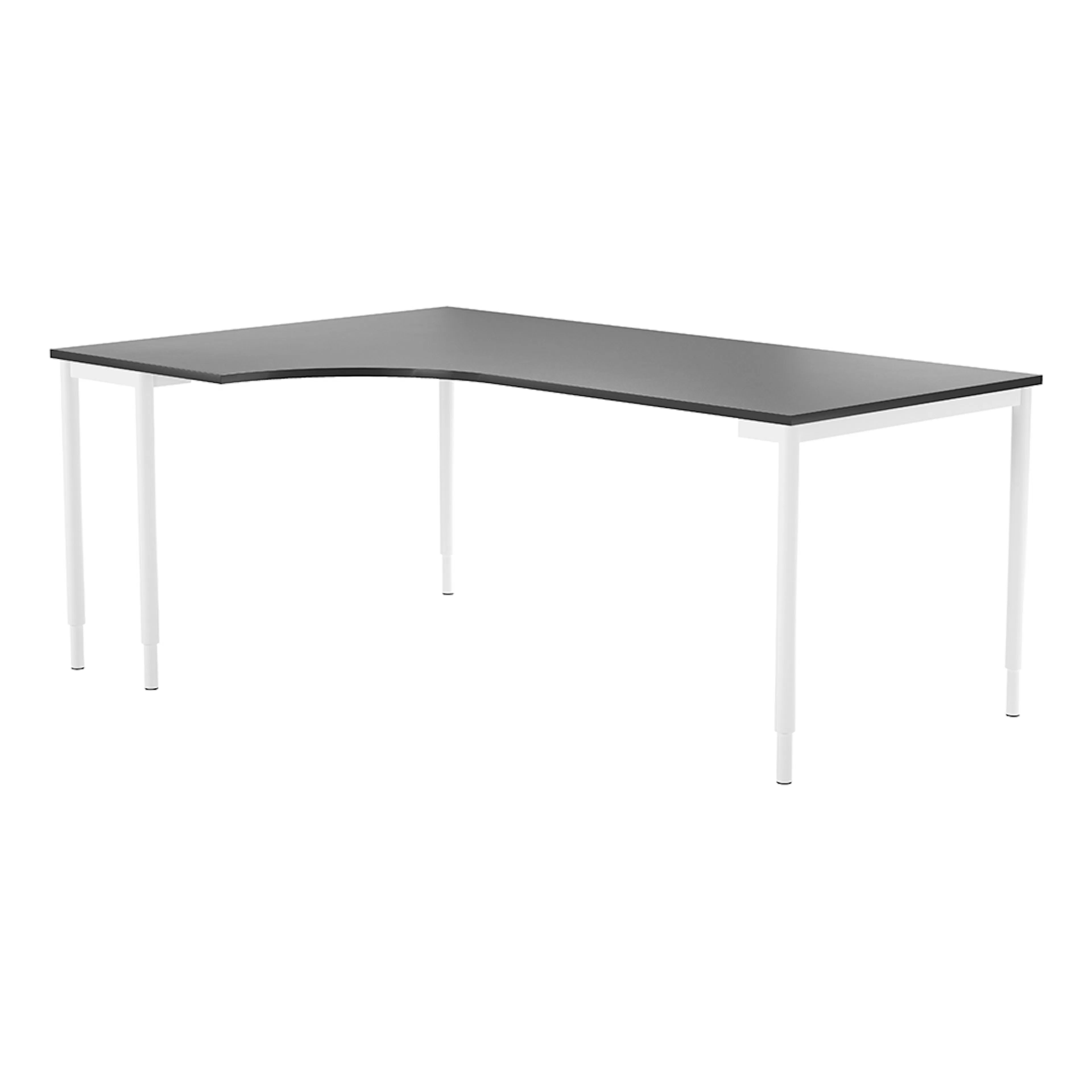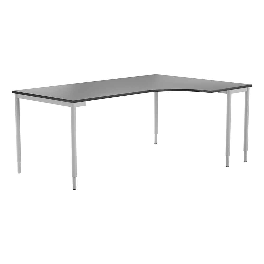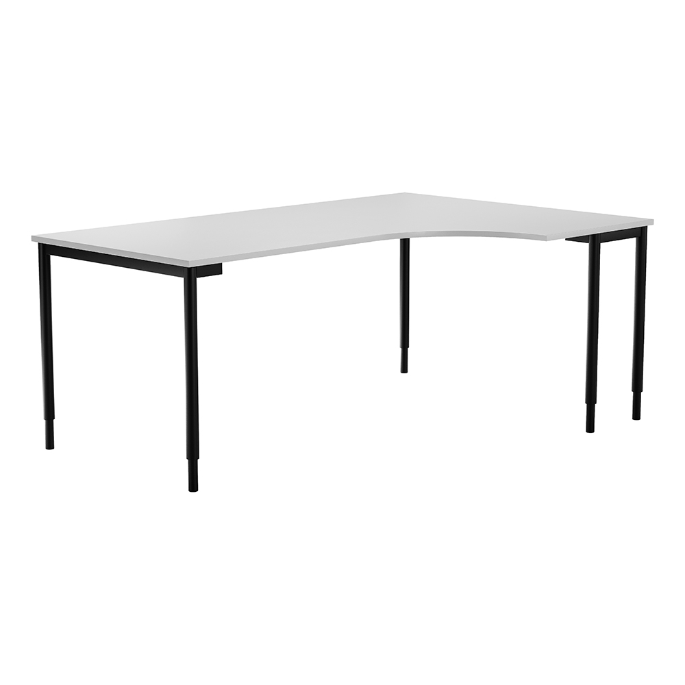Hörnbord i klassisk design med svängd skiva och med fem raka ben som ger en stabil konstruktion. Bordshöjden kan ställas in manuellt så arbetshöjden kan justeras om det behövs. Med den svängda skivan passar bordet utmärkt in i ett hörn för att utnyttja ytorna på arbetsplatsen på bästa sätt. Bordet finns i flera utföranden så du kan välja mellan olika bordsskivor och stativfärger. Kombinera med någon av våra hurtsar som får plats under bordet om du vill ha en smidig och flexibel förvaring till din arbetsplats.