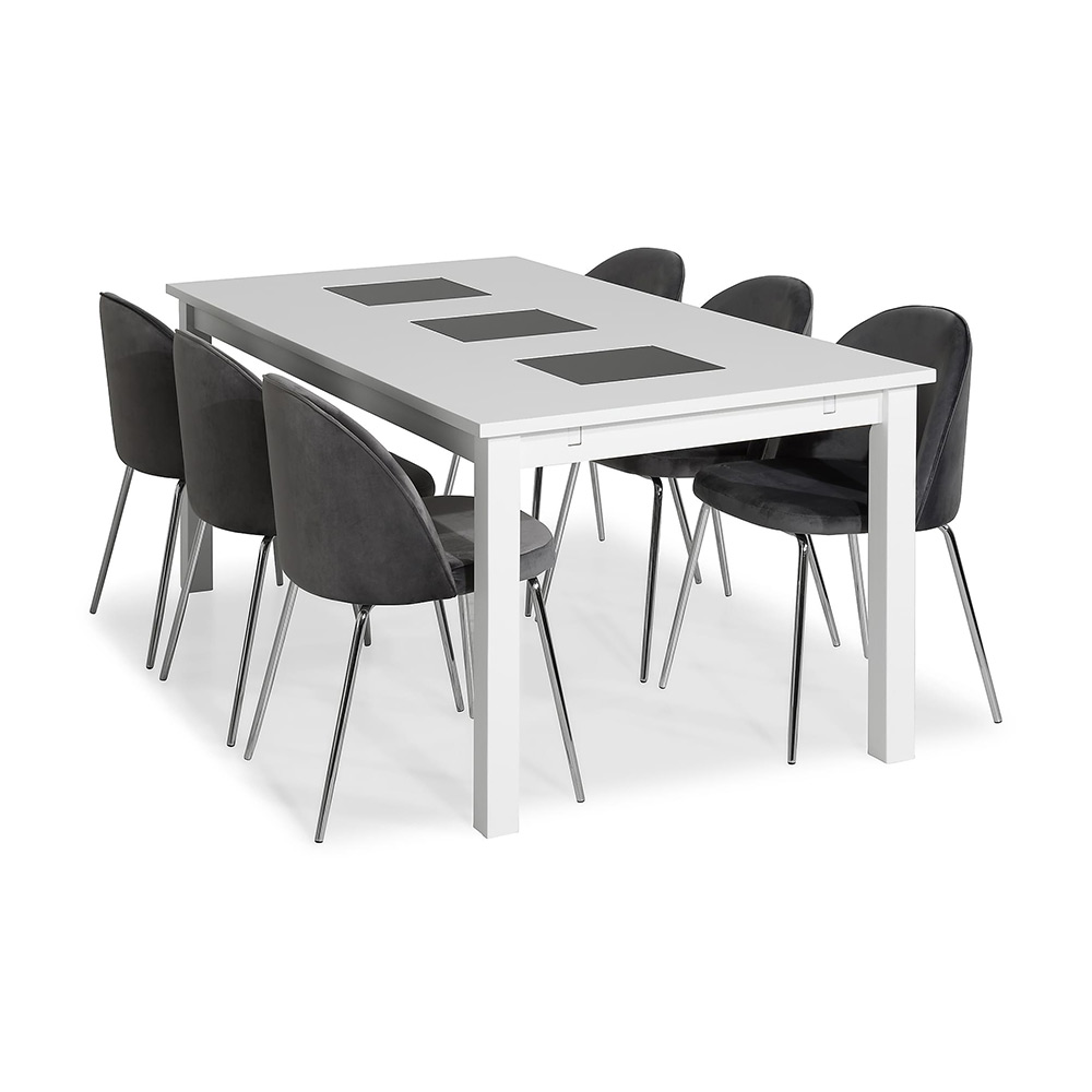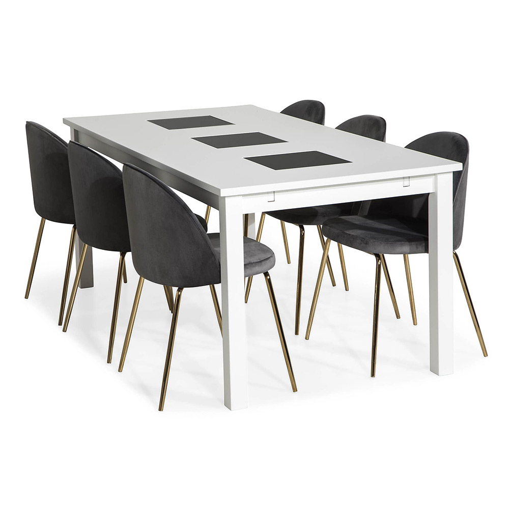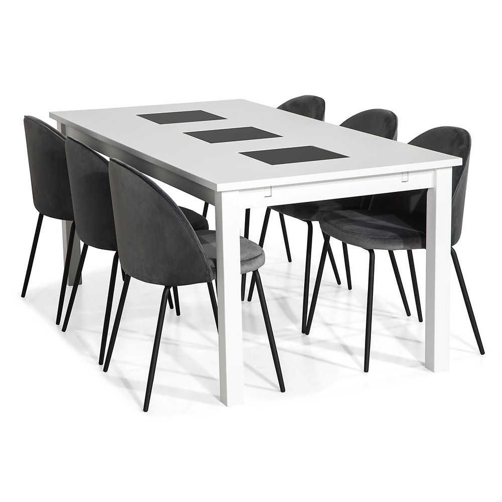 Matgrupp Jasmin Förlängningsbart 180 med 6 Felipe Stol Sammet från In Living är en stilren matgrupp med ett vitt bord med snygga detaljer och sex sammetsstolar.