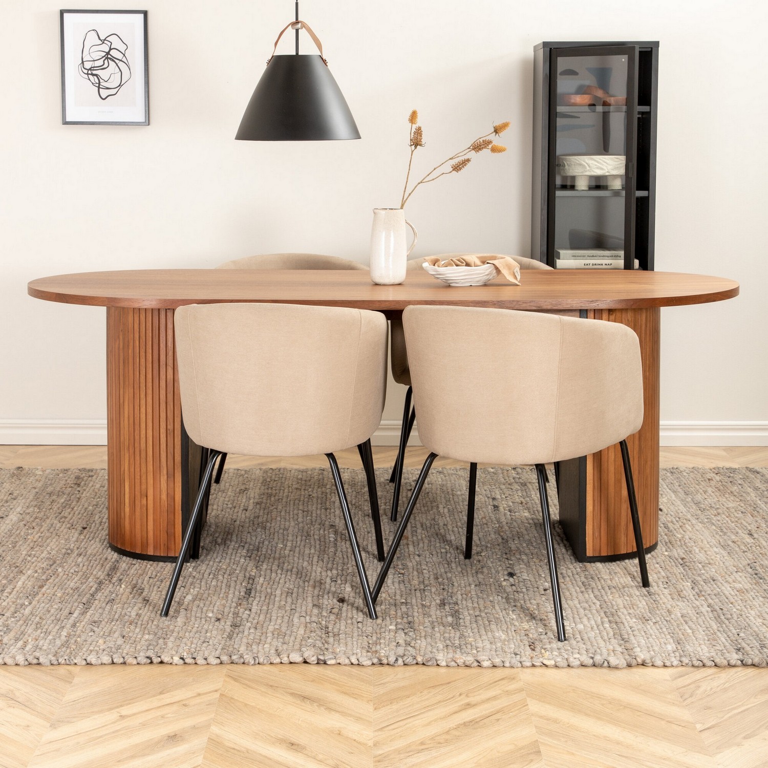 Matgrupp Bianca från Venture Home. Med ett ovalt matbord i MDF med faner med benvita samt svarta bordsben i trä och MDF. Matchas med 4 st Bergen matstolar med svarta stolsben i järn och beigea sitsar i polyester linne.