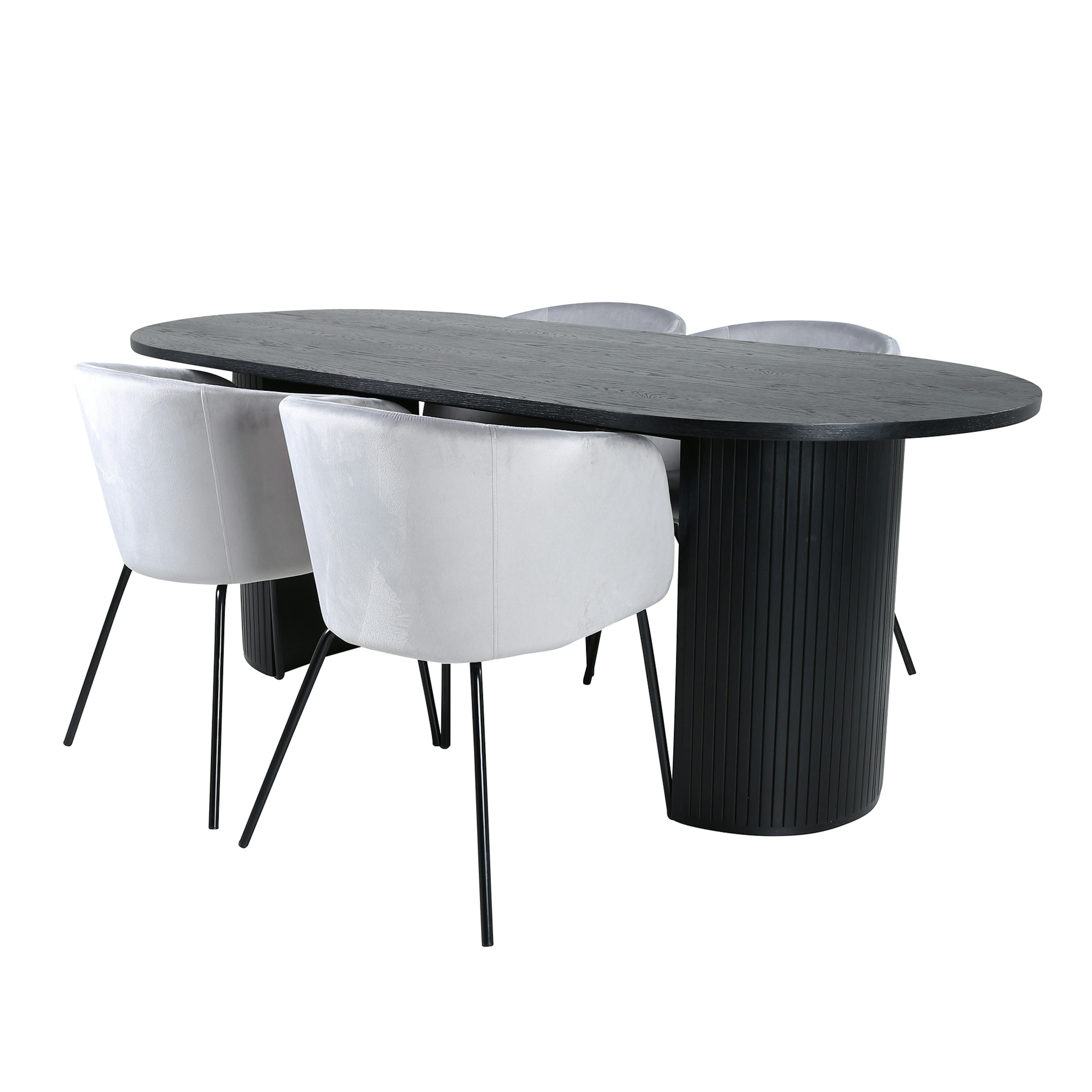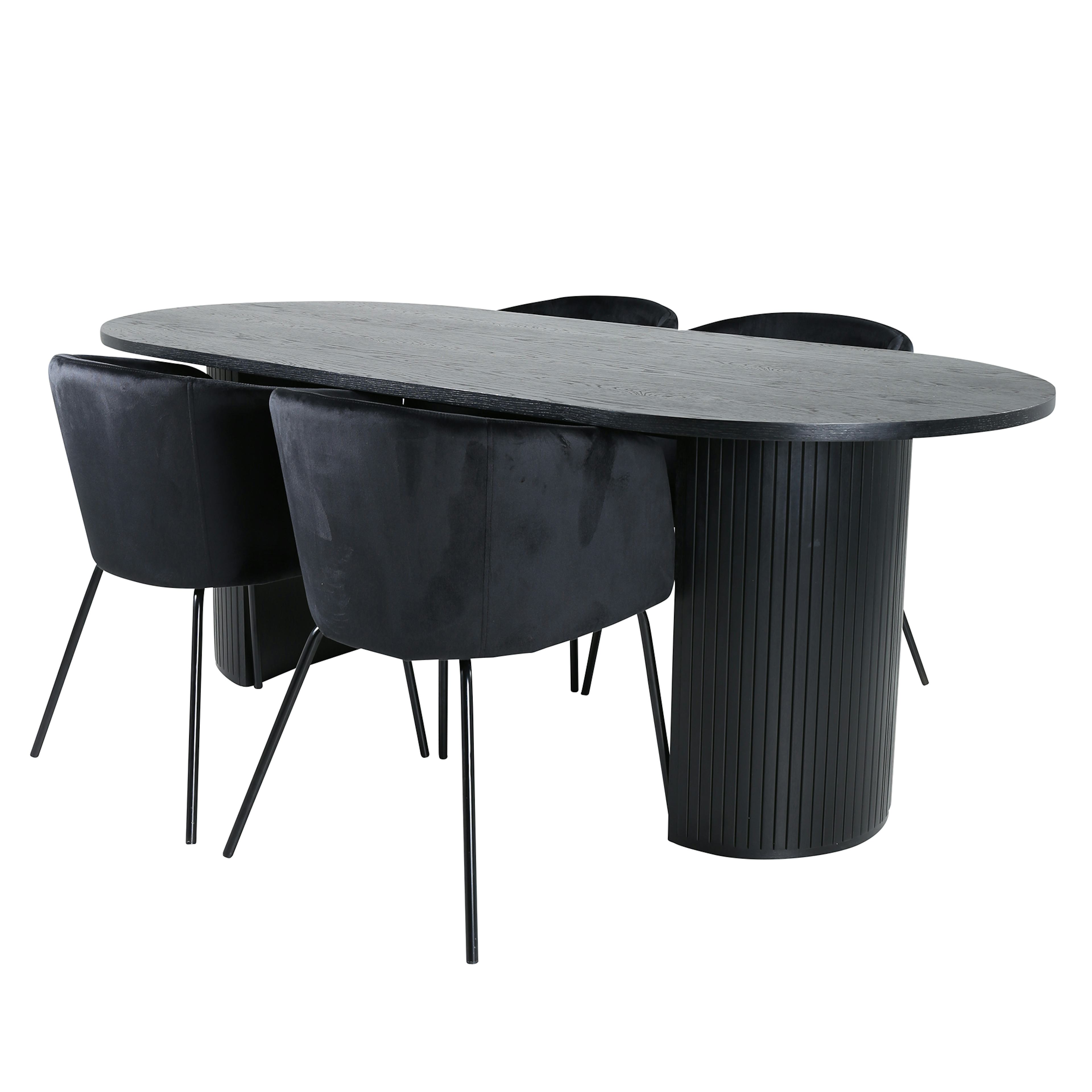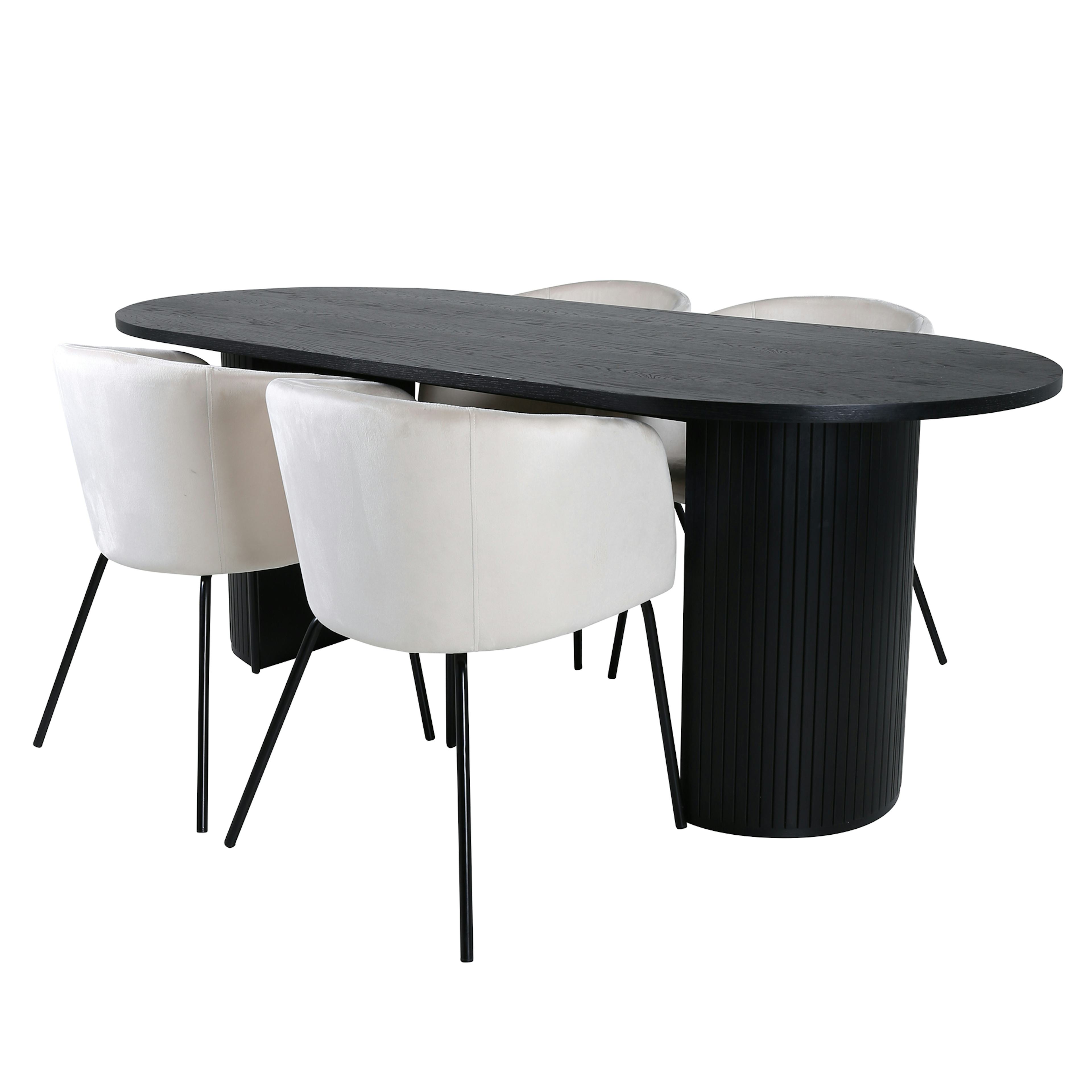 Matgrupp Bianca från Venture Home. Med ett ovalt matbord i svart MDF med faner med svarta bordsben i trä och MDF. Matchas med 4 st Bergen matstolar med svarta stolsben i järn och beigea sitsar i sammet.