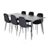 Matgrupp Dipp med 6 Polar Stolar Sammet från Venture Home är en modern matgrupp med ett rektangulärt matbord med en stomme och ben i svart pulverlackerad metall samt med en bordsskiva i svart fanér med en kärna i MDF. Det medföljer sex matstolar i en helklädd design med ben i svart pulverlackerad metall. Lätt rundad rygg och sits i stoppat polyestertyg med dekorsömmar på insidan av rygg och sits som bildar ett rutmönster. Lättare montering krävs.