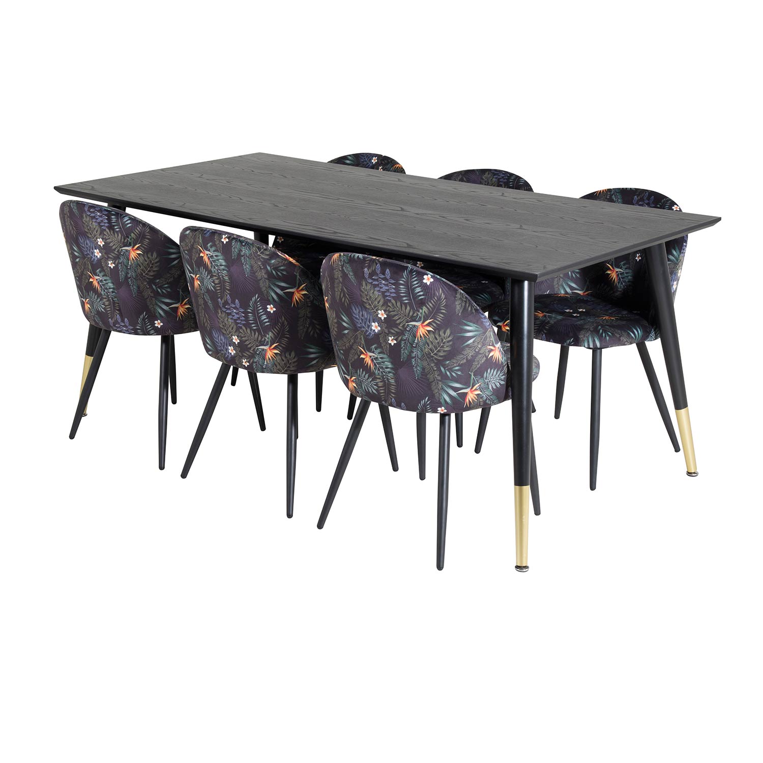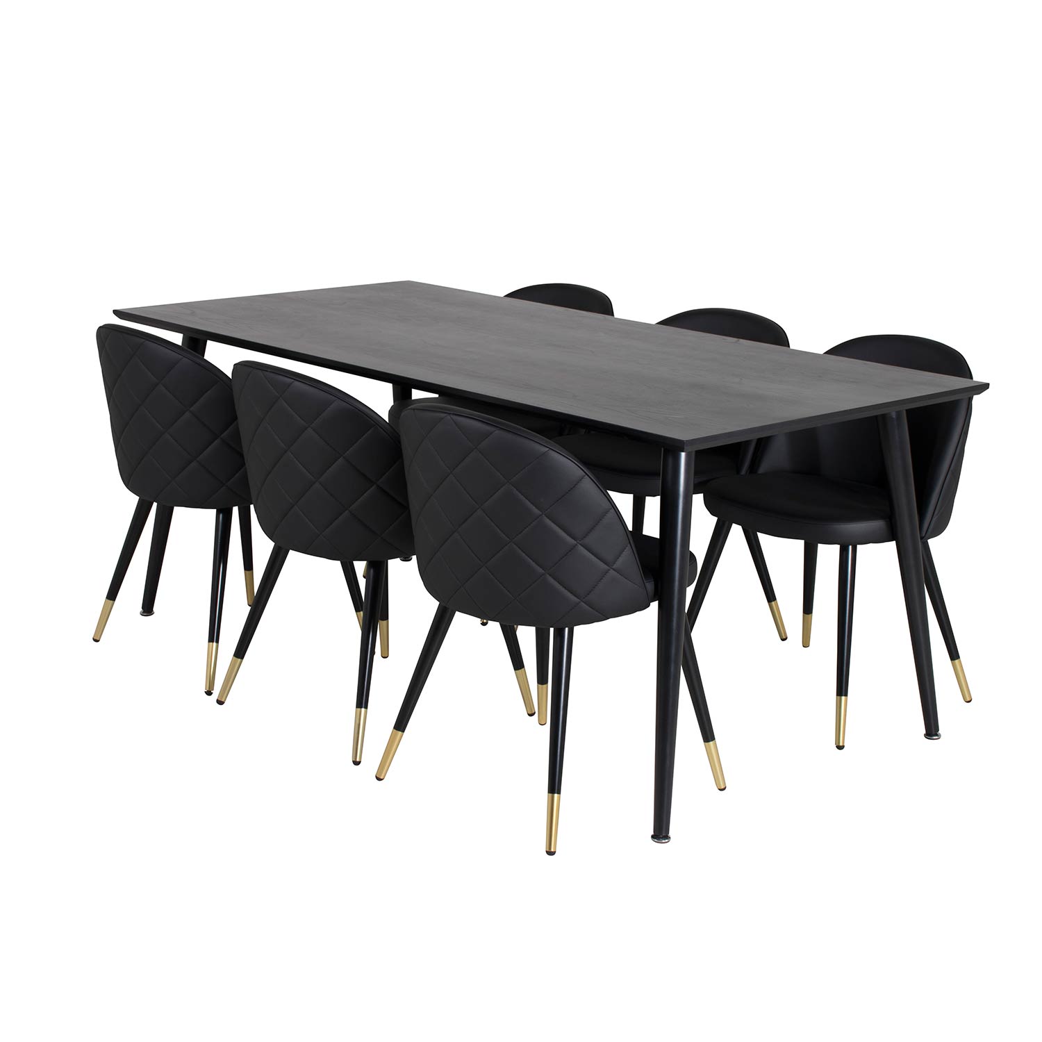 En snygg matgrupp från Venture Home bestående av Dipp matbord med sex stycken Velvet-stolar med svarta ben som har vackra detaljer.