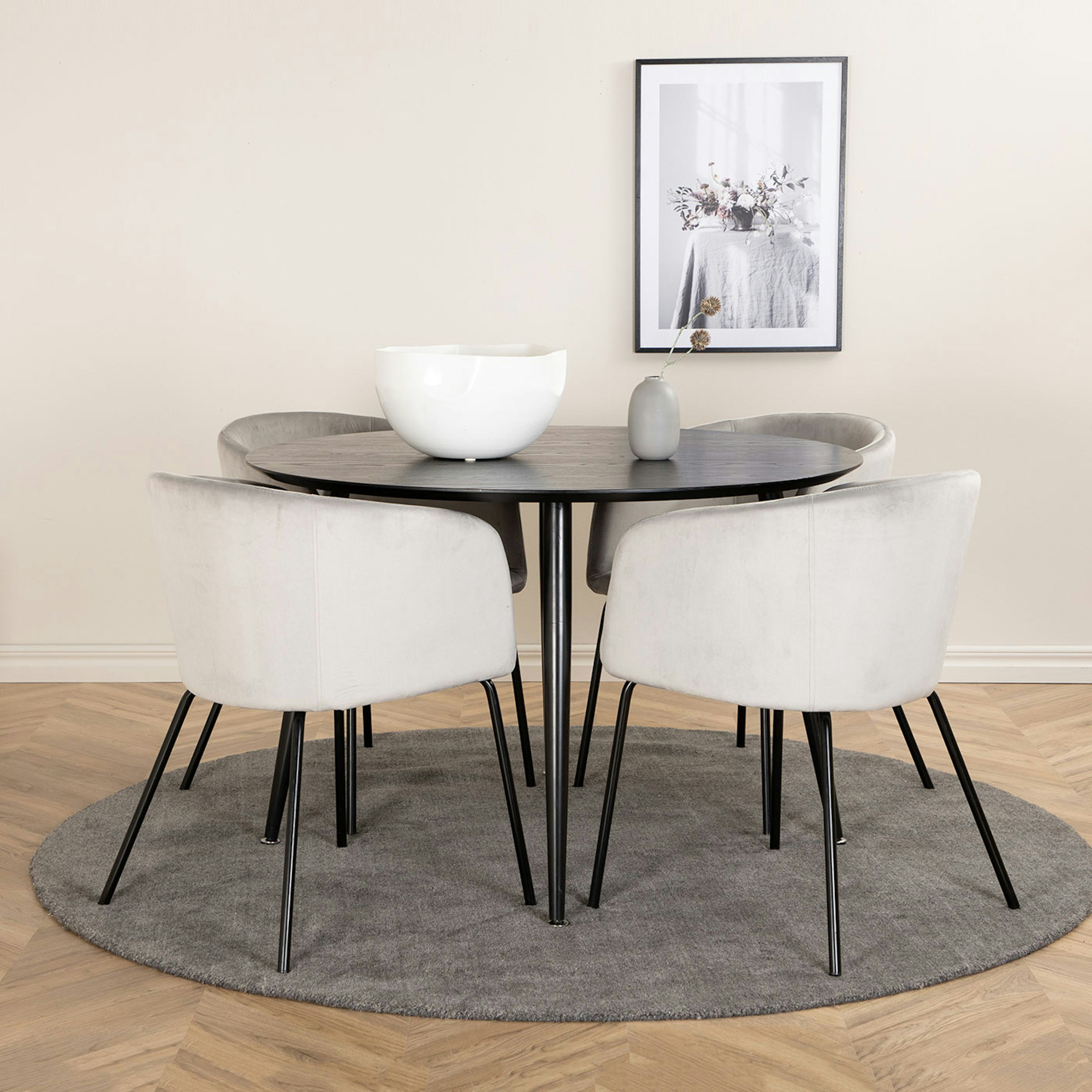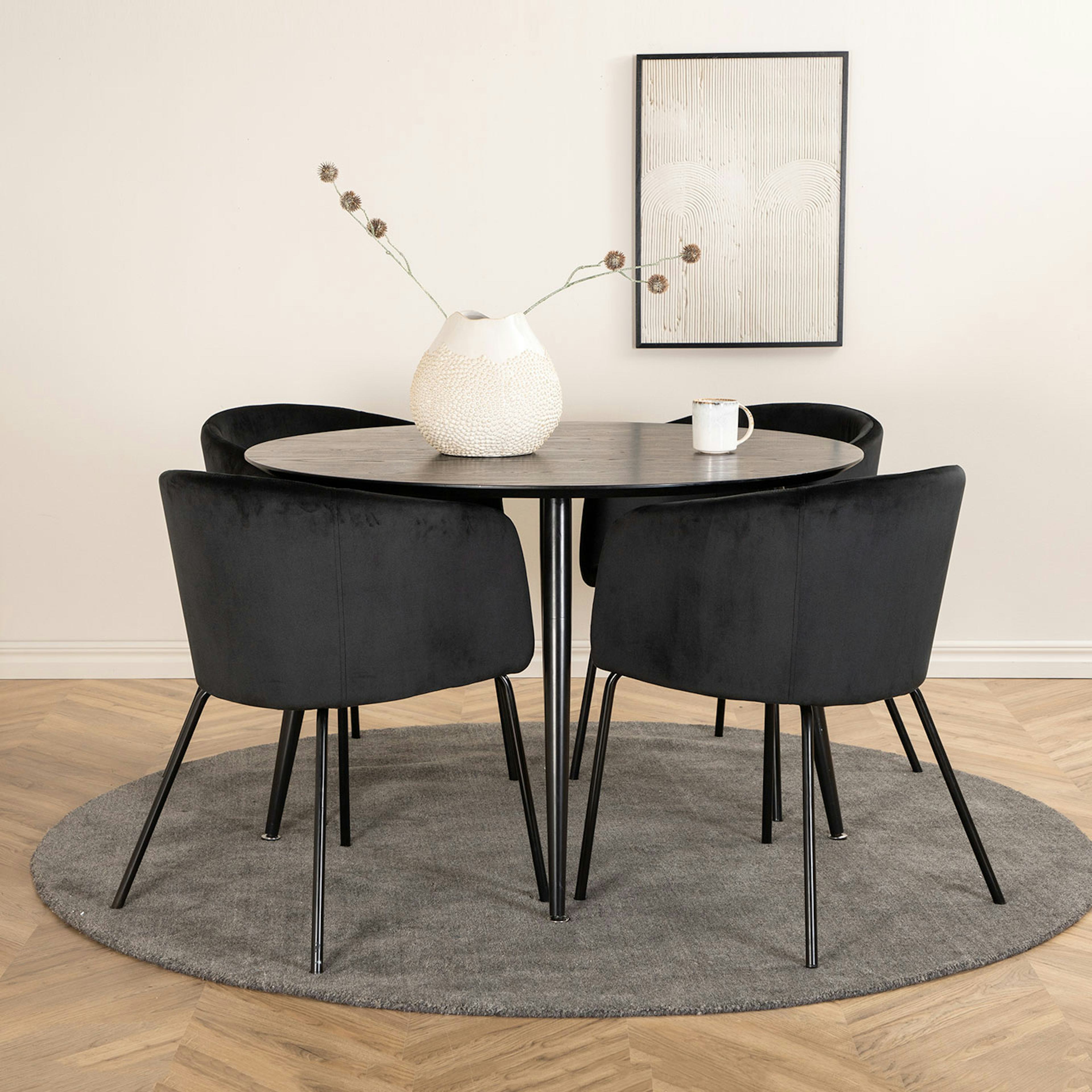 Matgrupp Dipp, med ett runt matbord i MDF med svarta bordsben i metall. Matchas med 4 st Berit matstolar med sitsar i sammet.