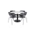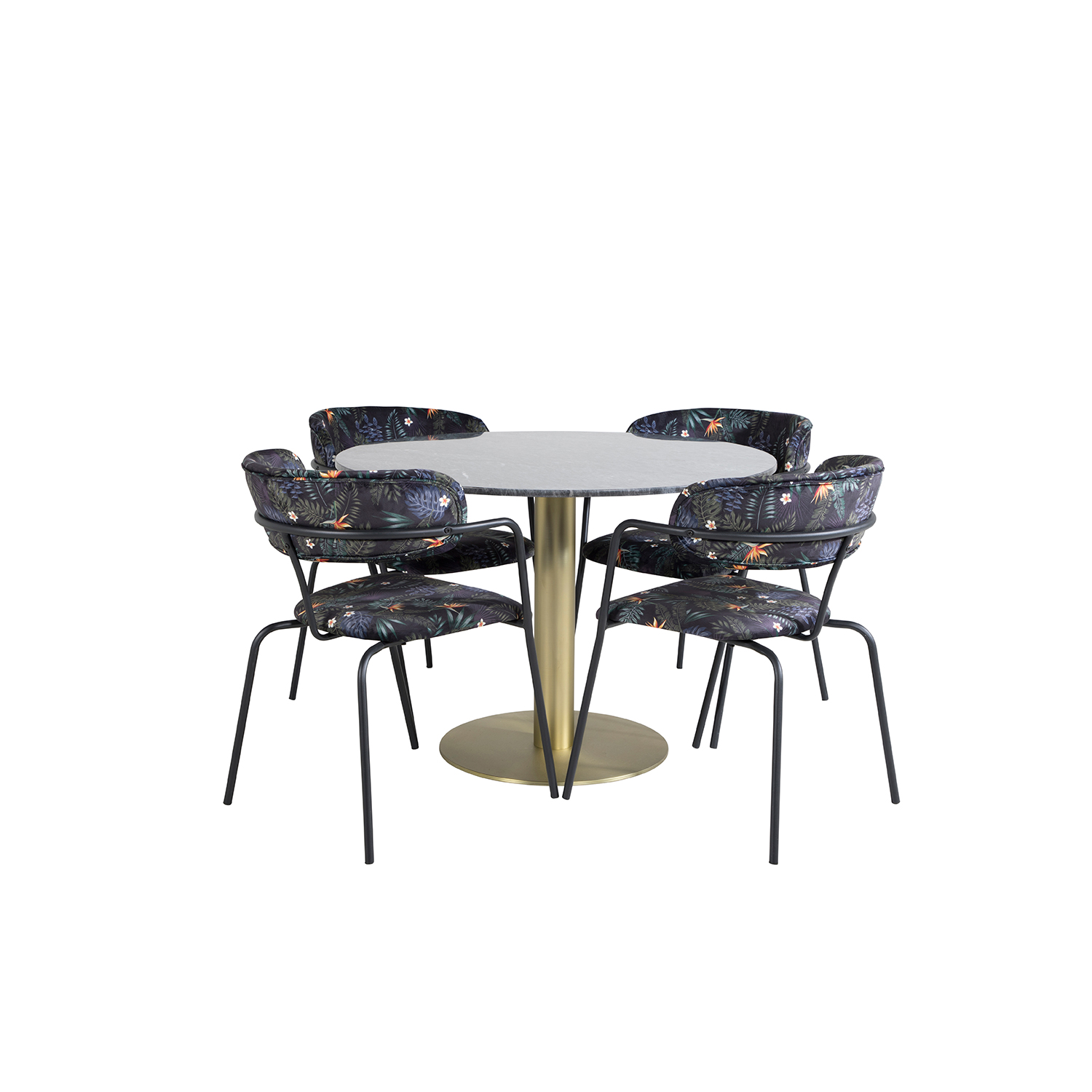 Matgrupp Estelle med 4 Aris Stolar PolyEstelletyg från Venture Home är en stilren matgrupp med ett runt matbord i modern design med trumpetfot i pulverlackerad metall med en bordsskiva i marmor. Det medföljer fyra karmstolar med stomme, ben samt integrerade armstöd i svart pulverlackerad metall. Stolarna har en rundad rygg och sits i stoppat, svart, blommönstrat polyEstelletyg. Lättare montering krävs.