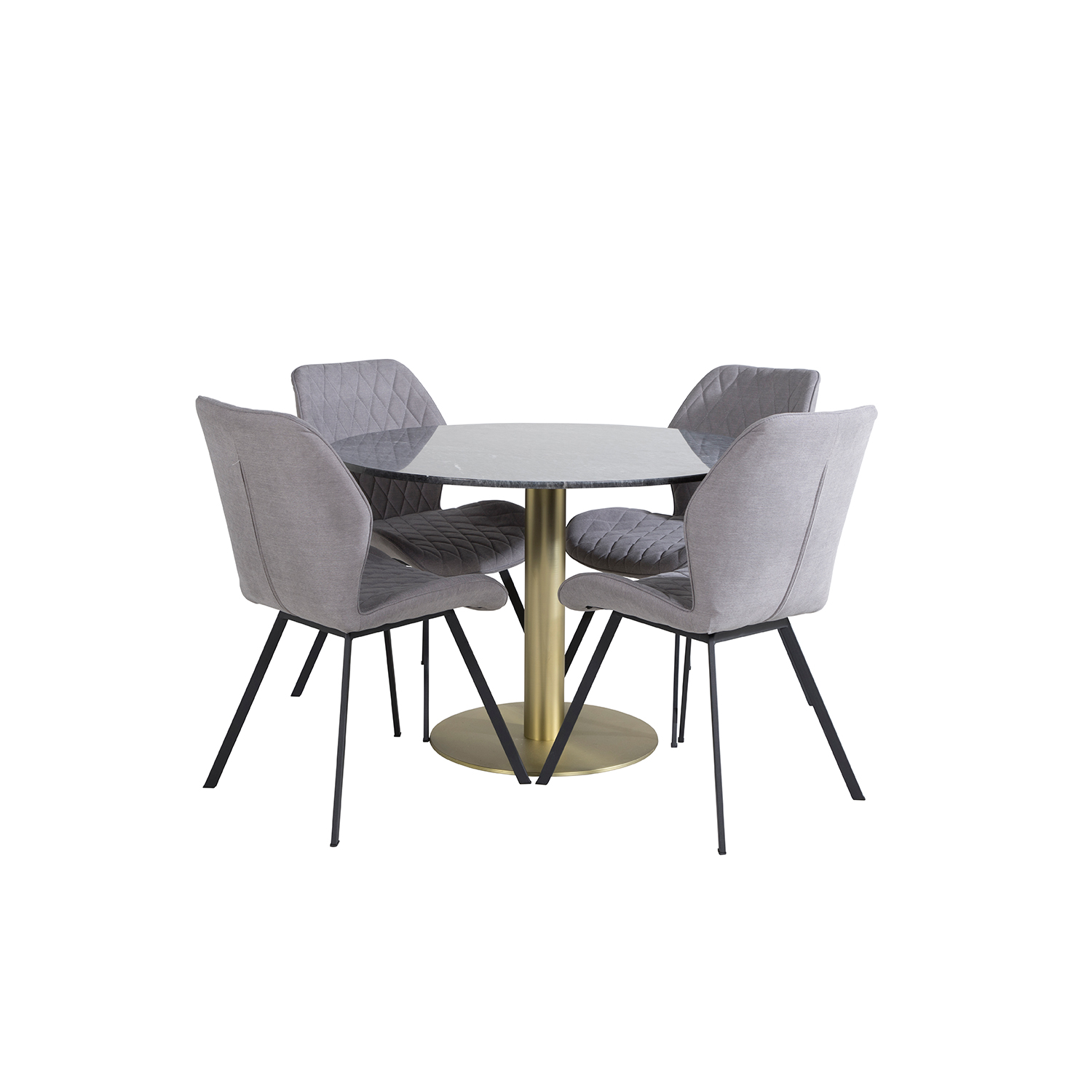 Matgrupp Estelle med 4 Geneva Stolar PolyEstelletyg från Venture Home är en stilren matgrupp med ett runt matbord i modern design med trumpetfot i pulverlackerad metall med en bordsskiva i marmor. Det medföljer fyra matstolar i en helklädd, exklusiv design med ben i svart pulverlackerad metall. Stolarna har en stoppad rygg och sits i ett skålformat utförande i polyEstelletyg. De har dessutom en dekorsöm på insidan av rygg och sits som bildar ett snyggt rutmönster. Lättare montering krävs.