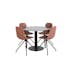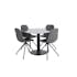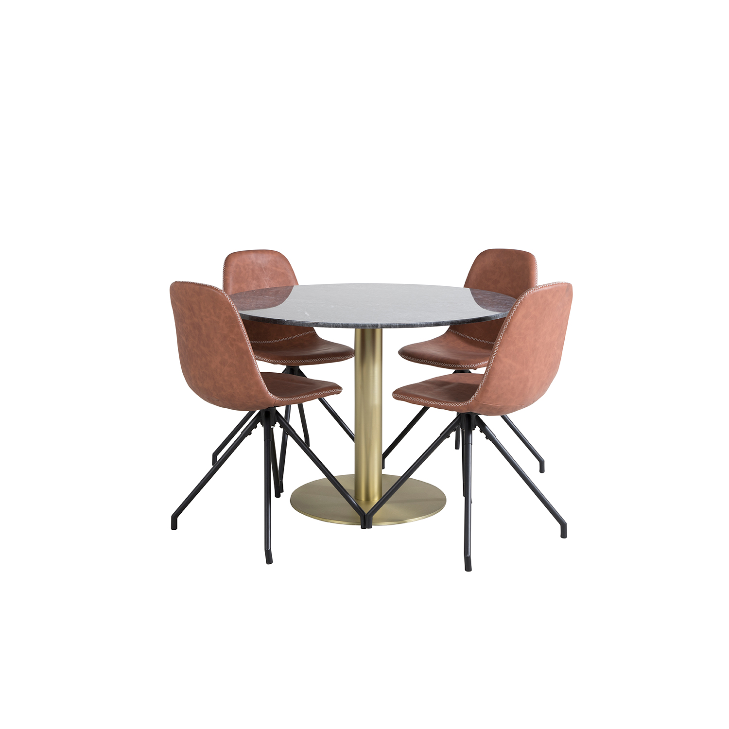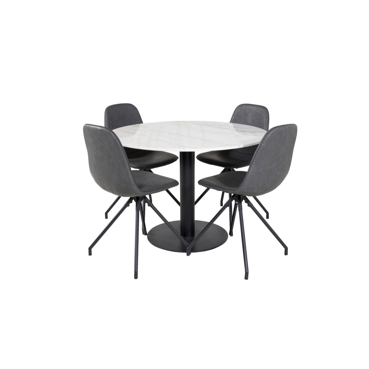 Matgrupp Estelle med 4 Pobbie Stolar Konstläder från Venture Home är en elegant matgrupp med ett runt matbord i modern design med trumpetfot i pulverlackerad metall med en bordsskiva i marmor. Det medföljer fyra matstolar i en helklädd design med snurrfunktion, stomme och ben i svart pulverlackerad metall med en lätt rundad rygg och sits i stoppat konstläder med dekorsöm. Lättare montering krävs.