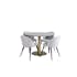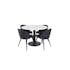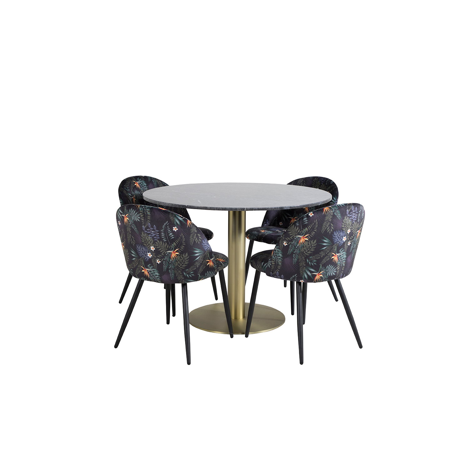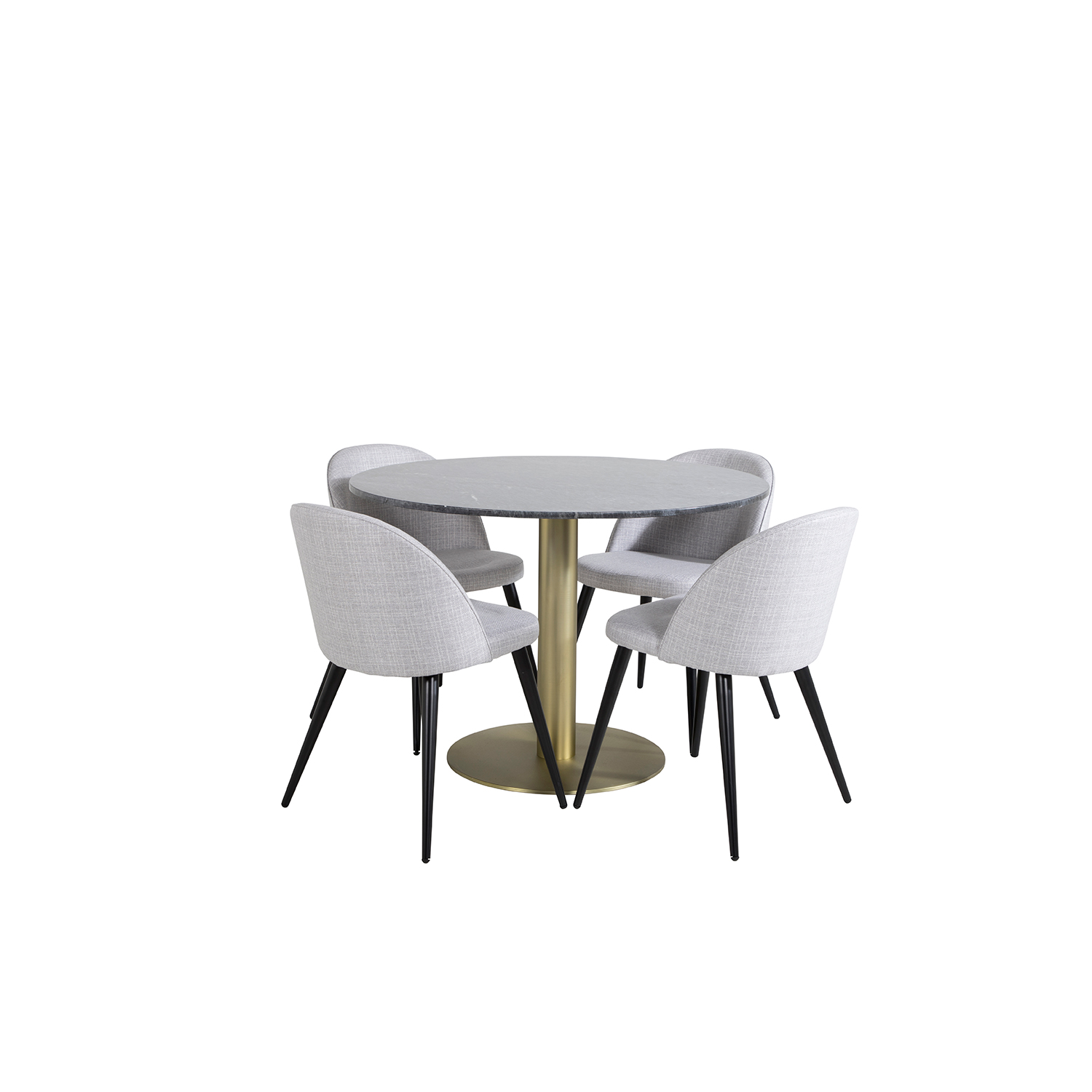 Matgrupp Estelle med 4 Valentina Stolar PolyEstelletyg från Venture Home är en elegant matgrupp med ett runt matbord i modern design med trumpetfot i pulverlackerad metall med en bordsskiva i marmor. Det medföljer fyra matstolar med en helklädd design, ben i pulverlackerad metall samt rundad rygg och sits i polyEstelletyg. Rygg och sits har mjuk stoppning. Lättare montering krävs.