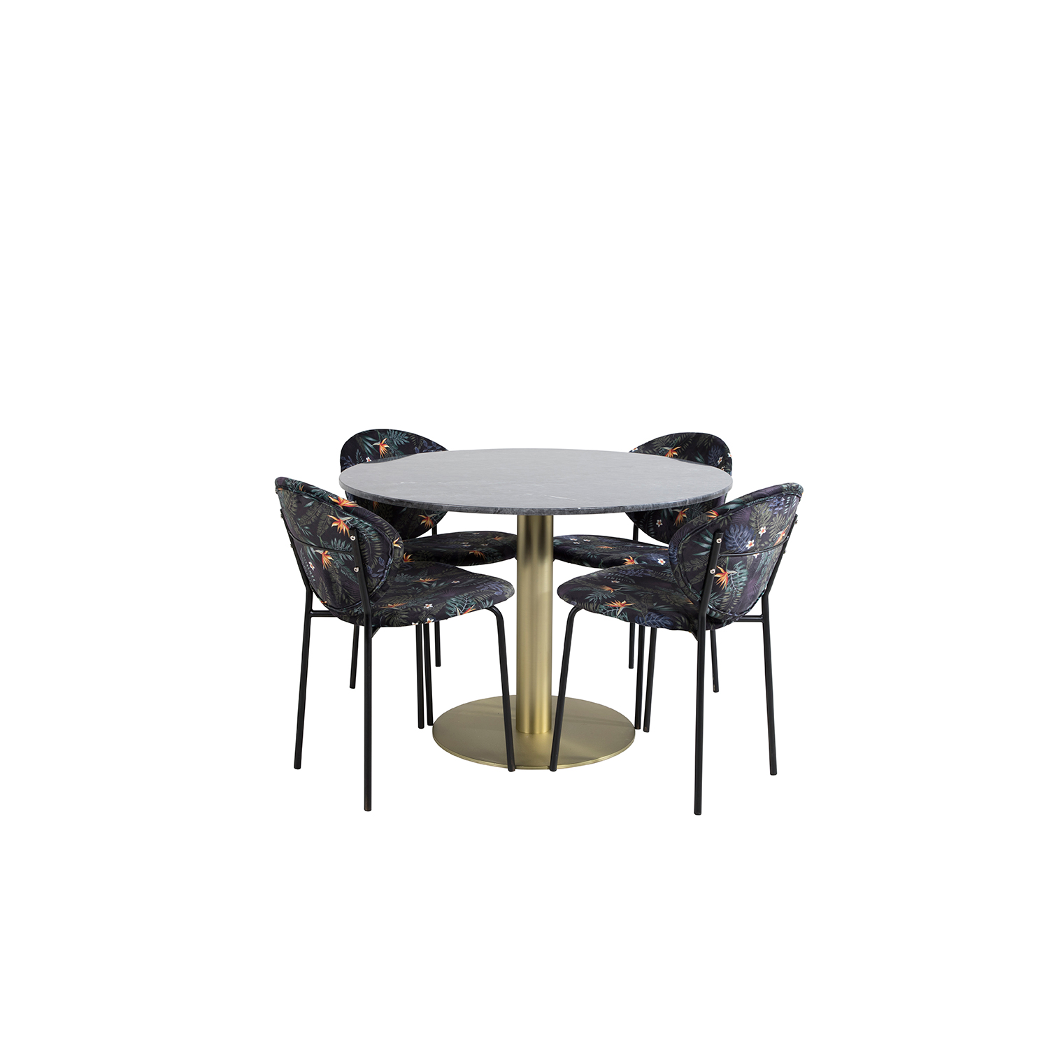 Matgrupp Estelle med 4 Valor Stolar PolyEstelletyg från Venture Home är en elegant matgrupp med ett runt matbord i modern design med trumpetfot i pulverlackerad metall med en bordsskiva i marmor. Det medföljer fyra matstolar med en stomme och ben i pulverlackerad metall i en snygg design med rund rygg. Stolarna har en rygg och sits i stoppat polyEstelletyg. Lättare montering krävs.