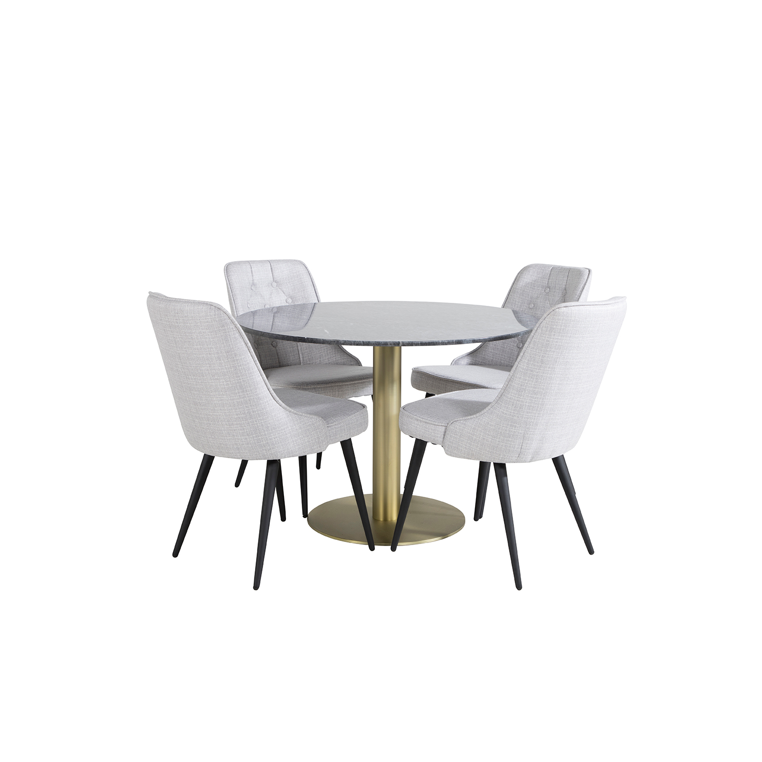 Matgrupp Estelle med 4 Vera Stolar PolyEstelletyg från Venture Home är en stilren matgrupp med ett runt matbord i modern design med trumpetfot i pulverlackerad metall med en bordsskiva i marmor. Det medföljer fyra matstolar i helklädd design med ben i svart pulverlackerad metall. Stolarna har en rygg med knappar och dekorsöm samt rygg och sits i polyEstelletyg med mjuk stoppning. Lättare montering krävs.