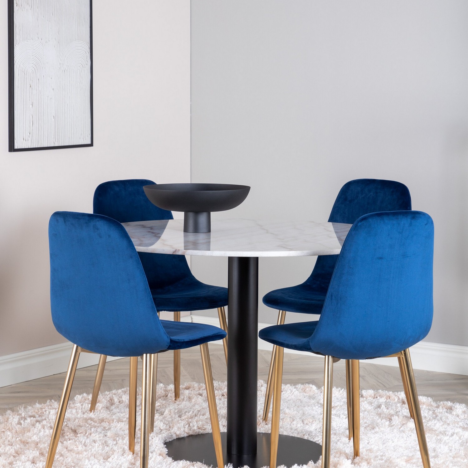 Matgrupp Estelle från Venture Home med ett runt matbord i vit marmor med svarta bordsben i metall. Matchas med 4 st Pobbie matstolar med stolsits i sammet och mässingsfärgade stolsben i metall.